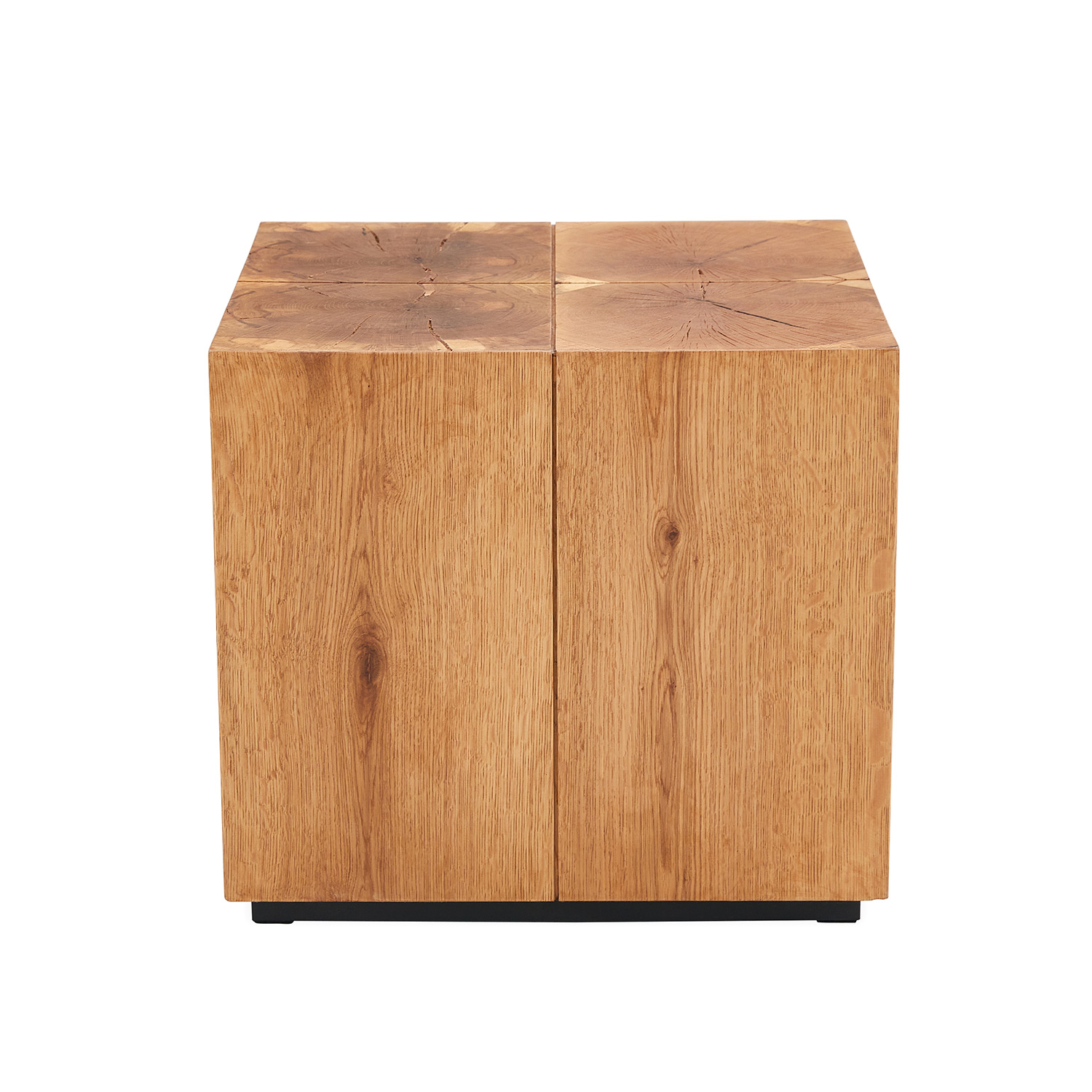 Abilaud BRONTE 50x50xH45cm, tamm. Massiivne, puidupakku meenutav abilaud on valmistatud MDF plaadist ning kaetud 6mm naturaalse tammespooniga. Laua pealmist pinda kaunistavad puidu südamiku ristlõiked, mille väikesed praod, aastaringid ja säsikaared annavad aimu puu elukaarest. Puidu pind on viimistletud õlivahaga. Laua must terasest alusraam on emailviimistlusega. Toote valmistamiseks on kasutatud FSC sertifikaadiga puitmaterjali.