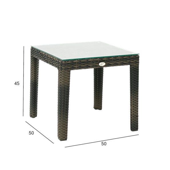 Abilaud WICKER 50x50xH45cm, tumepruun. Abilaud WICKER raam ja jalad on valmistatud alumiiniumist ja kaetud plastikpunutisega. Lauaplaat: 5mm karastatud läbipaistev klaas. Toode on muutlikes ilmastikutingimustes vastupidav ja väga lihtsalt hooldatav. HOIUSTAMINE: suvehooaja lõppedes soovitame aiamööblit hoiustada siseruumides. Puhastage ja kuivatage mööbel enne hoiule panekut. Kasutage hoiustamiseks kuiva ning hea ventilatsiooniga ruumi.
