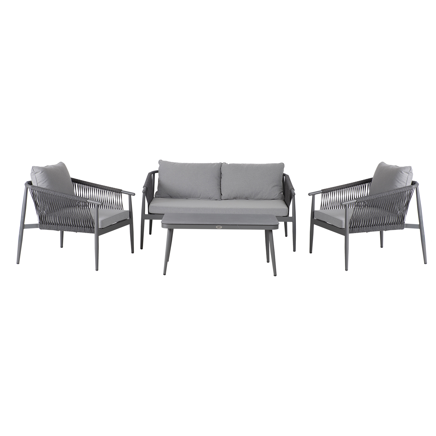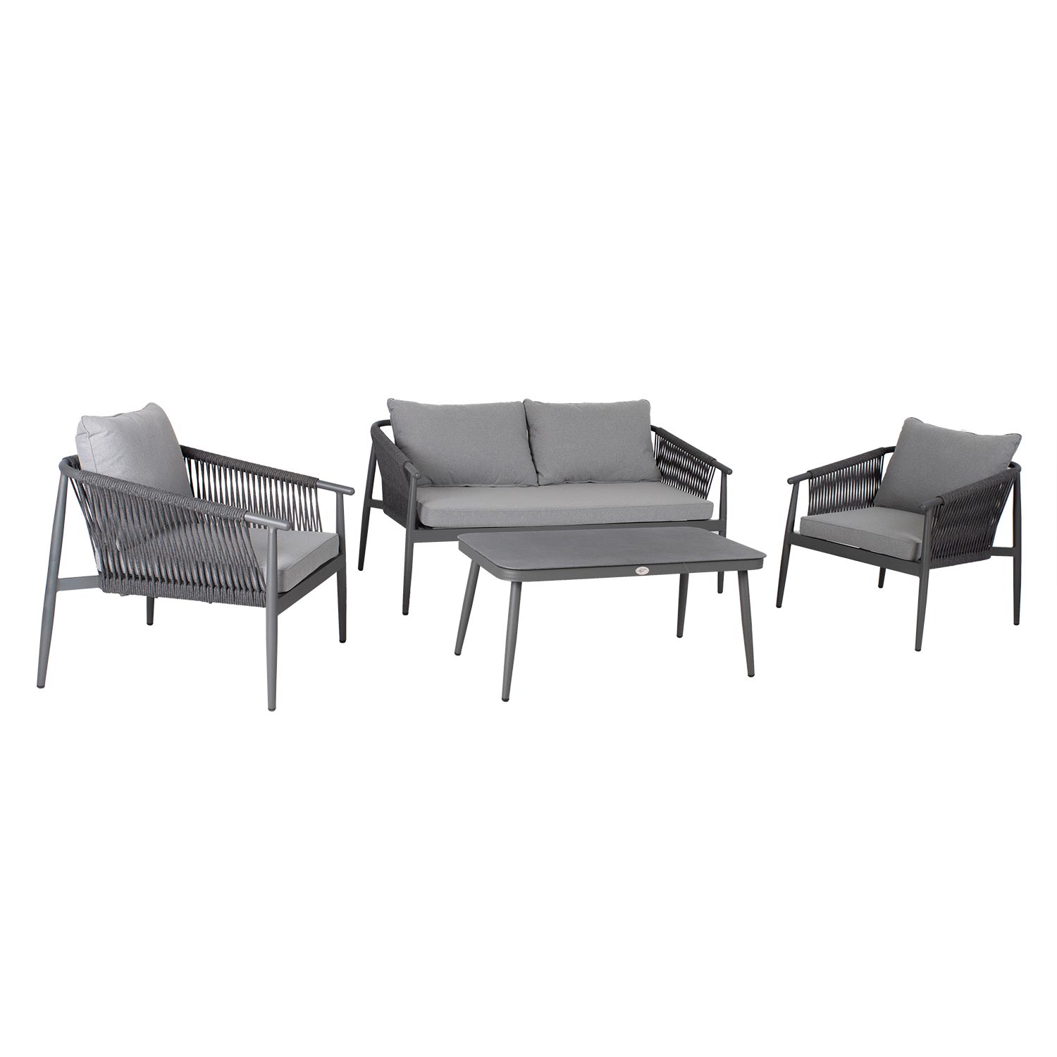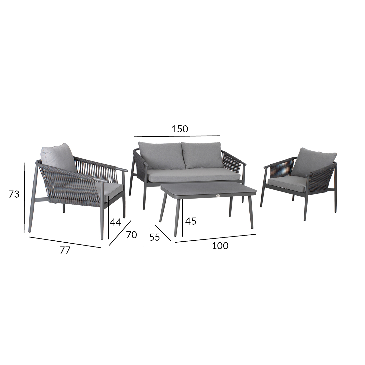 Aiamööbli komplekt WEILBURG. Komplekti kuuluvad laud, diivan ja 2 tooli. Kõigi komplekti osade põhikonstruktsioon on valmistatud alumiiniumist ja viimistletud halli pulbervärviga. Diivani ja tugitoolide selja- ja käetoed on kaetud halli nöörpunutisega. Laua mõõdud 100x55xH45cm, lauaplaat: 5mm kivivälimusega hall karastatud klaas. Diivani mõõdud 150x77xH73cm, tugitooli mõõdud 70x77xH73cm. Padjad kuuluvad komplekti. Patjade kattematerjal: hall polüesterkangas. Istmepadja paksus 8cm. Toode on muutlikes ilmastikutingimustes vastupidav ja väga lihtsalt hooldatav. Padjad on valmistatud õues kasutamiseks sobivatest materjalidest, kuid vajavad siiski kaitset liigniiskus ja UV kiirguse eest. Hea lahendus patjade igapäevaseks hoiustamiseks ja kuivana hoidmiseks on padjakast. Välitingimustes kasutatava mööbli eluea pikendamiseks soovitame kasutada välimööbli katteid. HOIUSTAMINE: suvehooaja lõppedes soovitame aiamööblit hoiustada siseruumides. Puhastage ja kuivatage mööbel enne hoiule panekut. Kasutage hoiustamiseks jahedat, kuiva ning hea ventilatsiooniga ruumi.