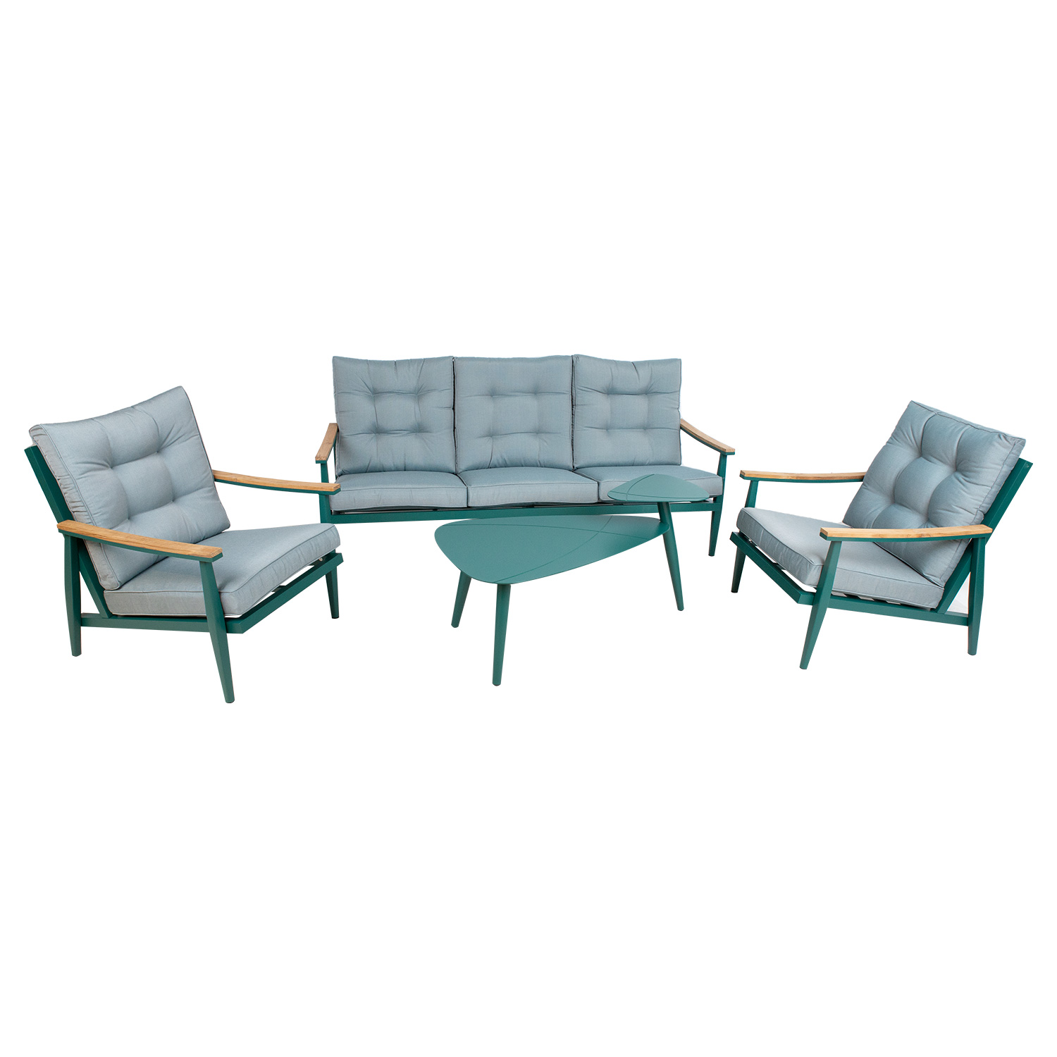 Aiamööblikomplekt CAVINE laud, diivan ja 2 tugitooli, roheline. Huvitav värvilahendus, 2-tasandiline diivanilaud ja tiigipuust liistud annavad komplektile omapära. Kõigi komplekti osade põhikonstruktsioon ja lauaplaat on valmistatud alumiiniumist ja viimistletud rohelise pulbervärviga. Paksud padjad tagavad suurepärase istumismugavuse. Padjakatted on valmistatud väga hea ilmastikukindlusega olefin kangast. Komplekti kuulub 3+2 istmepatja 63x63x10cm ja 3+2 seljatoepatja 68x68x10cm. Istmepatjade katted on lukuga suletavad, eemaldatavad ja pestavad. Seljatoepatjade katteid ei ole eemaldatavad. 3-kohalise diivani mõõdud on 199x91xH82cm, tugitooli mõõdud 73x91xH82cm, istme kõrgus raan ääreni on 32cm, koos padjaga 42cm. Laua mõõdud on 110x60xH47/59cm. Toode on muutlikes ilmastikutingimustes väga hästi vastupidav ja lihtsalt hooldatav. Kaitset ilmastikuolude eest vajavad ainult padjad. Välitingimustes kasutatava mööbli eluea pikendamiseks soovitame kasutada välimööbli katteid. HOIUSTAMINE: suvehooaja lõppedes soovitame aiamööblit hoiustada siseruumides. Puhastage ja kuivatage mööbel enne hoiule panekut. Kasutage hoiustamiseks kuiva ning hea ventilatsiooniga ruumi.