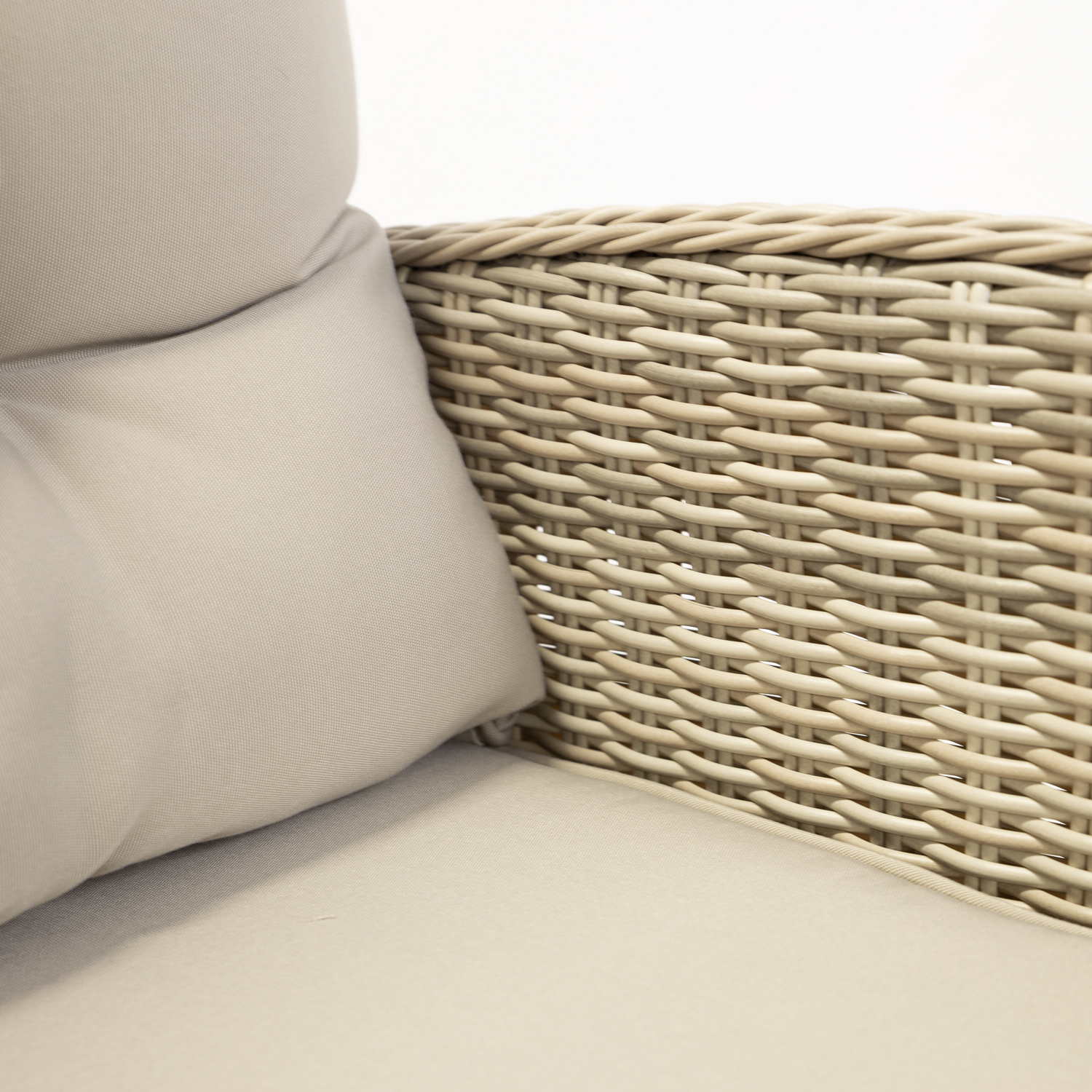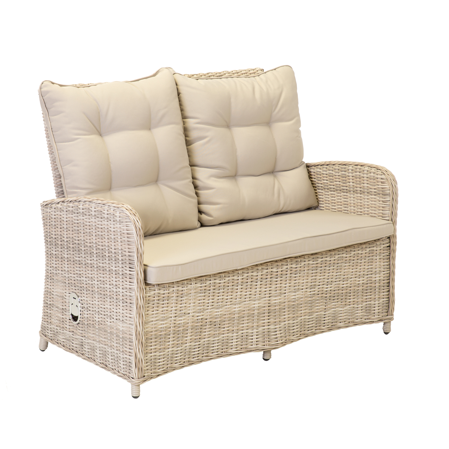 Aiamööblikomplekt EMERALD laud, diivan ja 2 tooli. Kõigi komplekti osade raamid on valmistatud alumiiniumist ja kaetud plastikpunutisega. Laua mõõdud on 109x65xH61,5cm. Lauaplaat: 5mm karastatud klaas. Diivani mõõdud on 120×70,5xH98,5cm, tooli mõõdud on 62×70,5xH98,5. Toolide ja diivani seljatoed on reguleeritavad. Padjad kuuluvad komplekti. Padjakatted on valmistatud helehallist polüesterkangast. Istmepatjade paksus 6cm. Toode on muutlikes ilmastikutingimustes vastupidav ja väga lihtsalt hooldatav. Kaitset ilmastikuolude eest vajavad ainult padjad. Välitingimustes kasutatava mööbli eluea pikendamiseks soovitame kasutada välimööbli katteid. HOIUSTAMINE: suvehooaja lõppedes soovitame aiamööblit hoiustada siseruumides. Puhastage ja kuivatage mööbel enne hoiule panekut. Kasutage hoiustamiseks kuiva ning hea ventilatsiooniga ruumi.