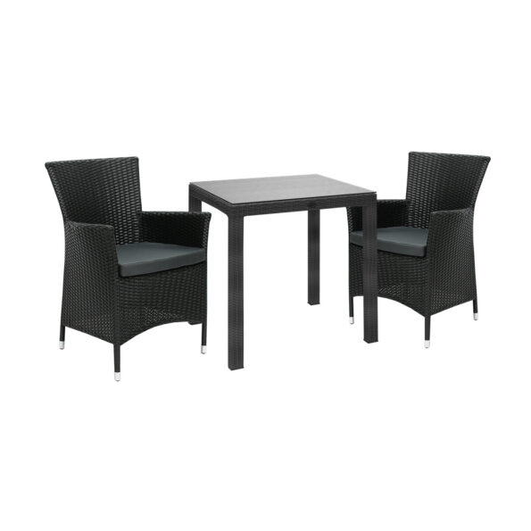 Aiamööblikomplekt WICKER laud ja 2 tooli, must. Laua mõõdud on 73x73xH71cm. Lauaplaat: 5mm läbipaistev karastatud klaas. Laua pulbervärvitud alumiiniumraam on kaetud plastikpunutisega. Tooli tugev ja stabiilne terasraam on kaetud plastikpunutisega. Istmepadi kuulub komplekti. Padja mõõdud 46x47x4,5cm. Padjakate on valmistatud polüesterkangast. Tooli üldmõõdud on 61x58xH86cm. Istme laius 46cm, istme sügavus 47cm, istme kõrgus 48cm. Käetoe kõrgus maast 62cm. Kaalupiirang 120kg. Toode on muutlikes ilmastikutingimustes hästi vastupidav ja ei nõua erilist hooldust. Välitingimustes kasutatava mööbli eluea pikendamiseks soovitame kasutada välimööbli katteid. HOIUSTAMINE: suvehooaja lõppedes soovitame aiamööblit hoiustada siseruumides. Puhastage ja kuivatage mööbel enne hoiule panekut. Kasutage hoiustamiseks kuiva ning hea ventilatsiooniga ruumi.