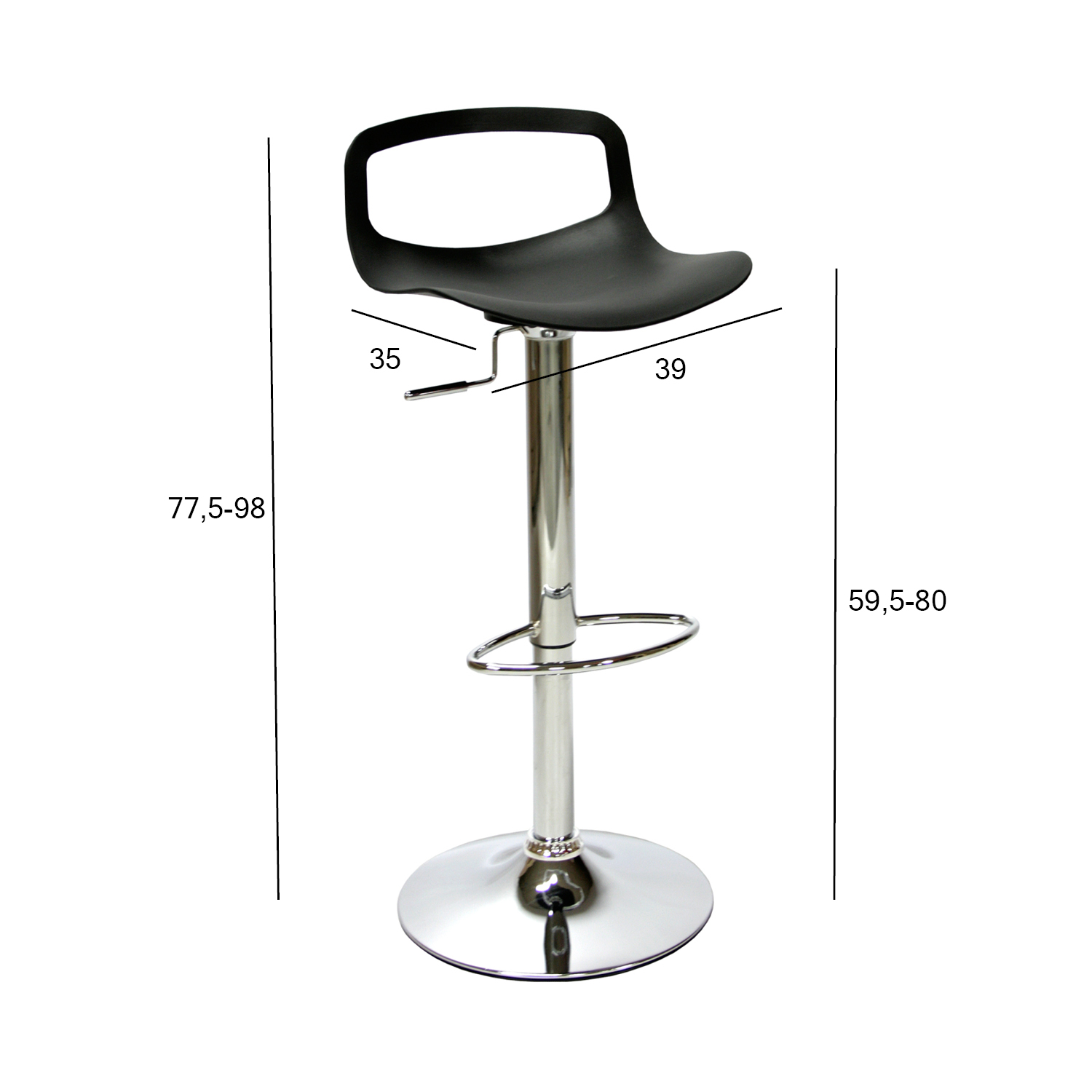 Baaripuki üldmõõdud on 39x35xH77,5-98cm, istme laius 39cm, istme sügavus 35cm, istme kõrgus 57,5-78cm.