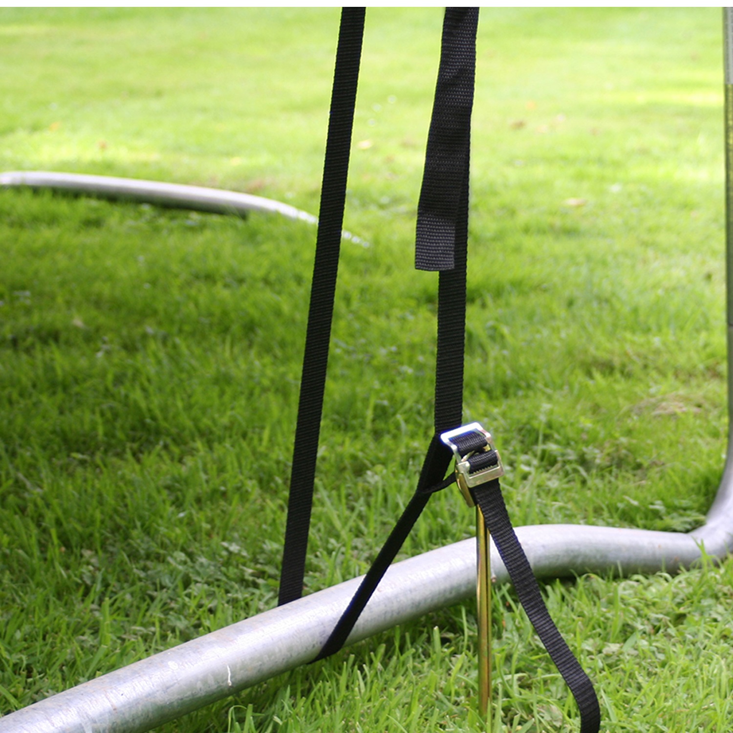 Paigaldamiseks keerake ankur otse maasse, seejärel kinnitage lühem rihma ots läbi ankru aasa ja pikem ots batuudi raami külge, pingutage rihmad.