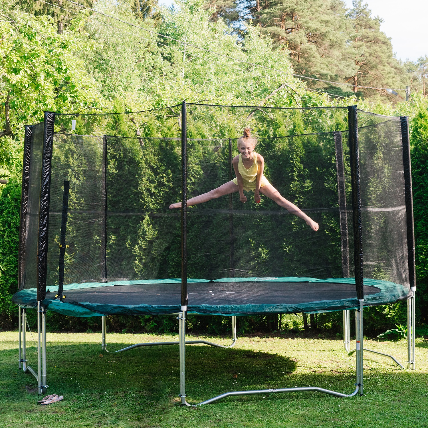 Batuut turvavõrguga D426cm, rohelise äärega. Batuut on tore võimalus värskes õhus aktiivseks ajaveetmiseks kogu perele. Batuudi kõrgus maast on 88cm. Elastne ja vastupidav hüppematt on valmistatud musta värvi polüpropeenist. Turvaääre pealmine kiht on valmistatud rohelisest PVC materialist, alumine pool on polüetüleenkangas. Kahe kihi vahel on 15+6mm polüetüleenvahust pehmendus. Turvaääre laius on 27cm. Batuudi raam ja jalad on valmistatud galvaniseeritud terastorust. Ülemise ääre toru mõõt on D45x1,5mm, jalatorude mõõt on D38x1,5mm. Batuudil on 88 vedru – 138mm/D25x3,2mm. Turvavõrk on valmistatud musta värvi polüestervõrgust. Sissepääsuava on tõmblukuga suletav. Tugipostid on valmistatud galvaniseeritud terastorust D25,4×1,1mm. Postide ümber on vahtplastist pehmendus. Võrgu üldkõrgus on 268cm, kõrgus batuudi äärest 180cm. Kaalupiirang 180kg. Pika kasutusaja ja ilmastikutingimuste mõjul kulunud batuudi osad on võimalik välja vahetada. Varuosadena on saadaval, turvavõrk, turvaäär, hüppamismatt ja batuudivedrud. HOIUSTAMINE: batuudi eluea pikendamiseks soovitame see suvehooaja lõppedes lahti monteerida ja hoiustada kuivas, hea ventilatsiooniga ruumis. Puhastage ja kuivatage matt ja turvaäär enne hoiule panekut.