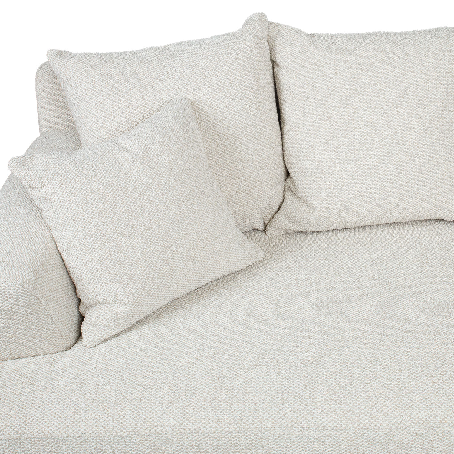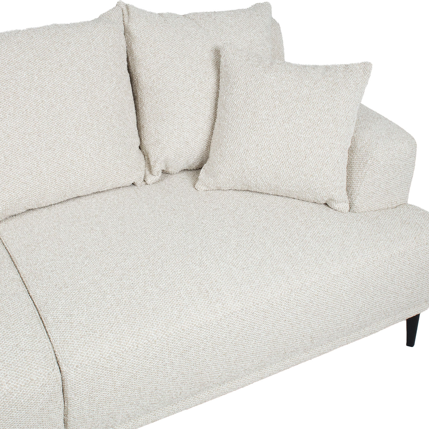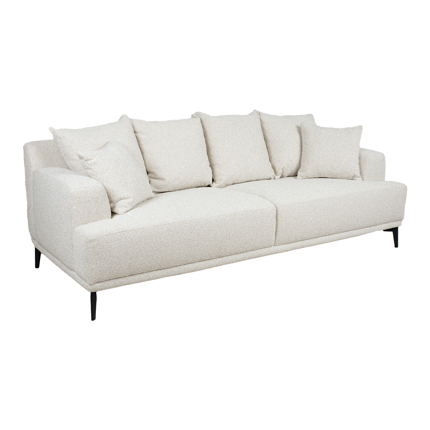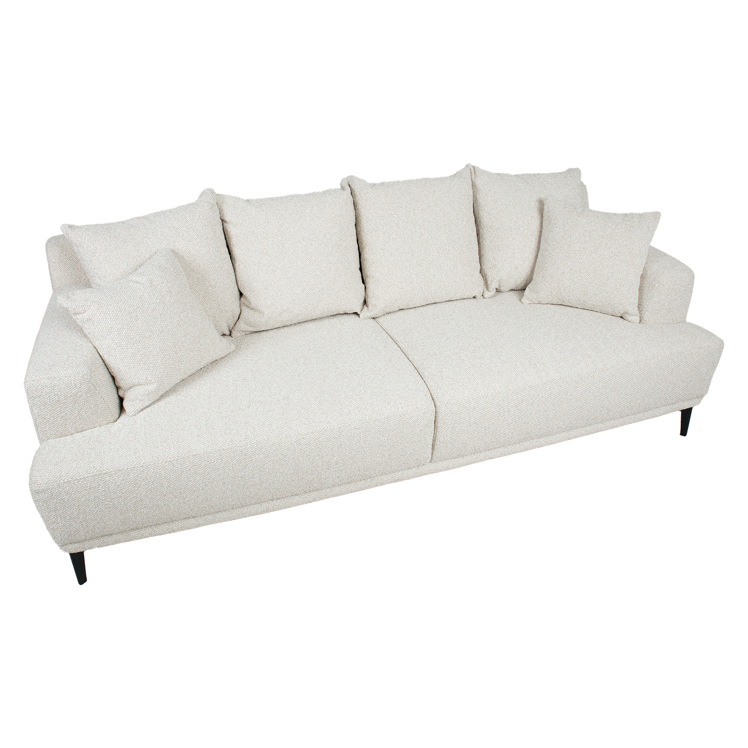 Luksuslik, efektse kangaga kaetud hele diivan on tõeline pilgupüüdja. Lahtised seljatoepadjad mõjuvad kutsuvalt ja pakuvad suurepärast mugavust.