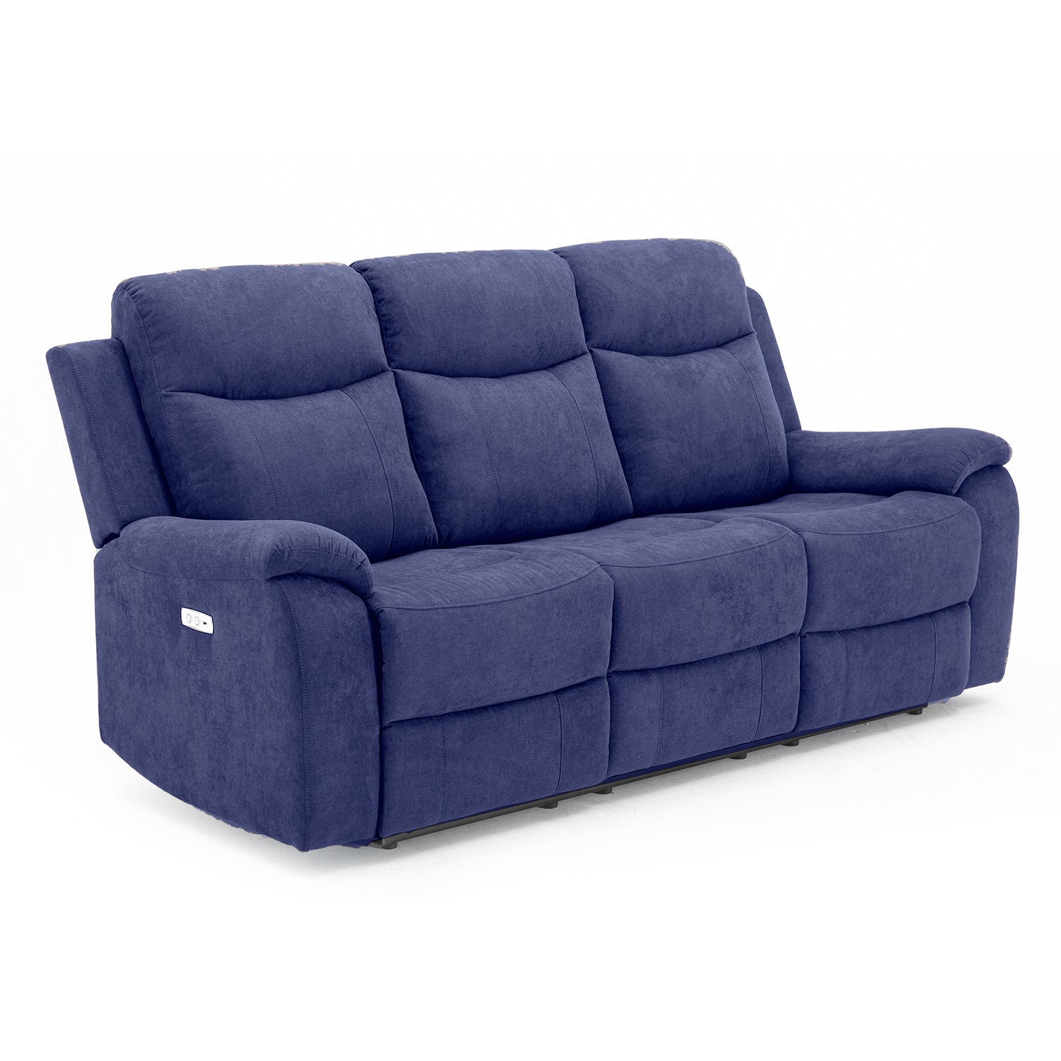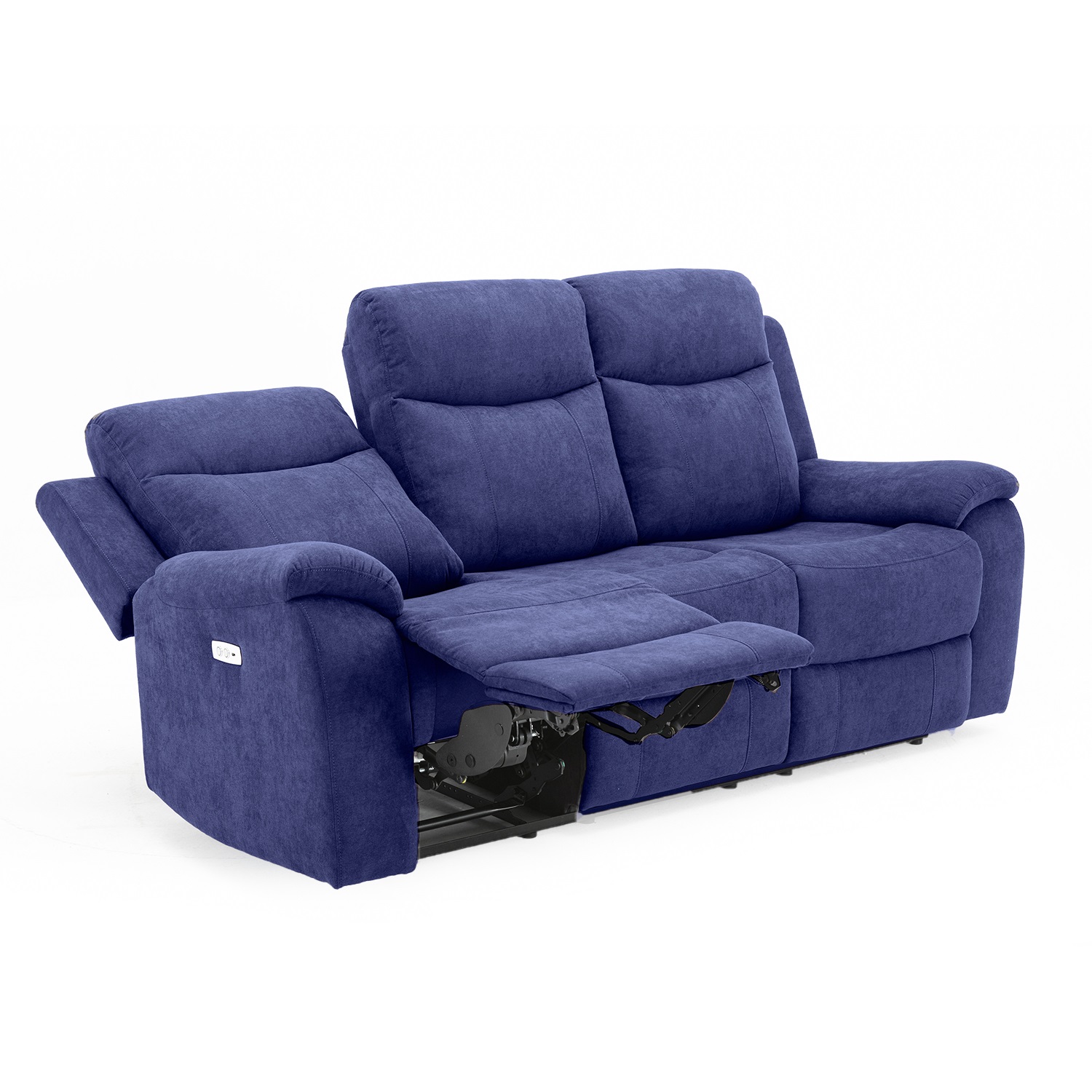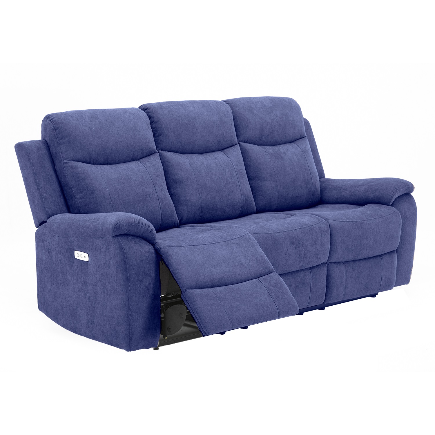 Diivan MILO 3-kohaline elektriline recliner 209x96xH103cm, sinine. Recliner tüüpi diivani äärmiste istmete selja- ja jalatoe asendit on võimalik muuta elektrilise mehhanismi abil. Jalatuge üles tõstes liigub seljatugi sujuvalt kaasa lamavasse asendisse. Keskmine iste ei ole reguleeritav. Kattematerjal: 100% polüesterkangas, Martindale 15 000. Karkass: puit, vineer ja metall. Tugitoolil on siksak ja pocket vedrustus. Polsterdus: polüuretaanvaht.
