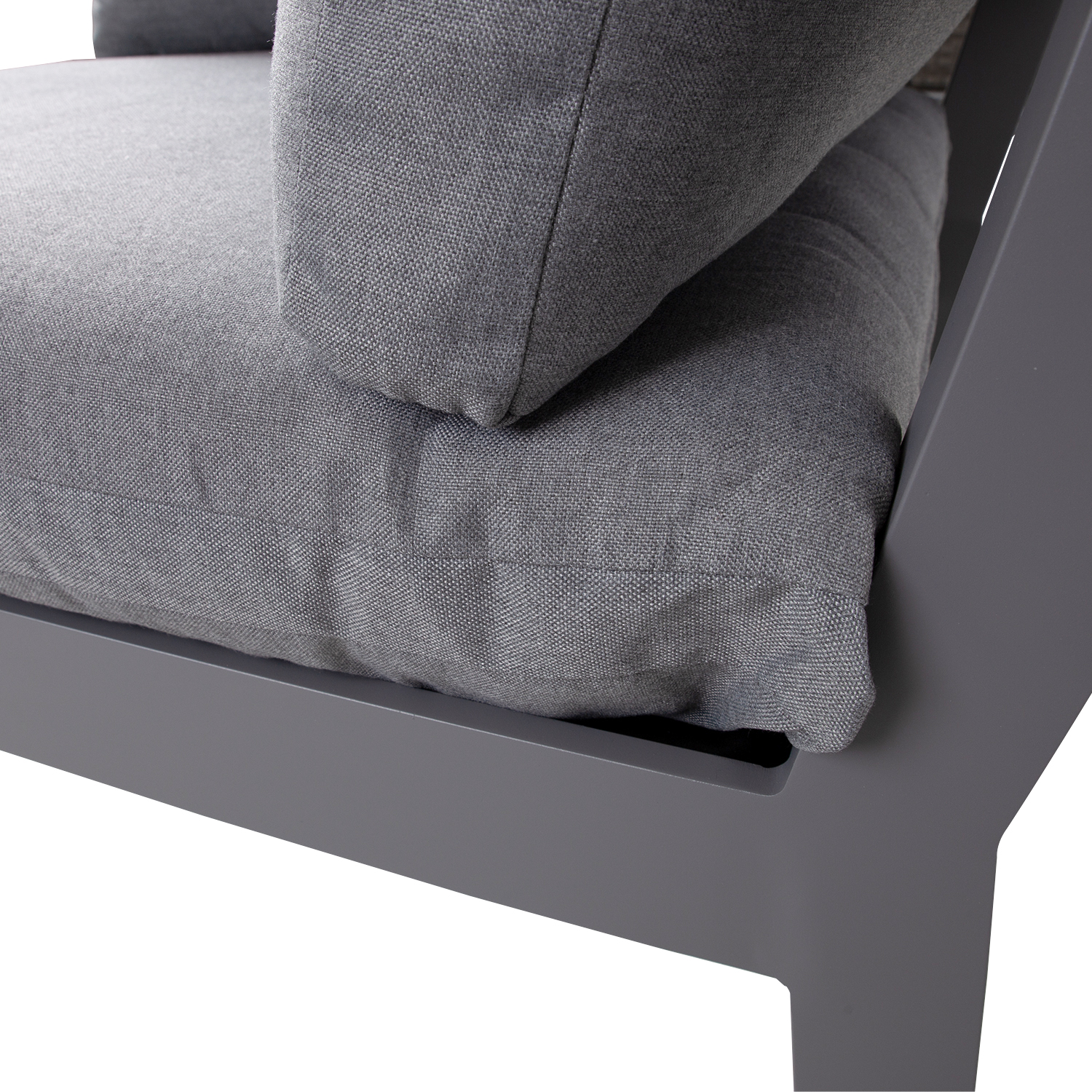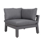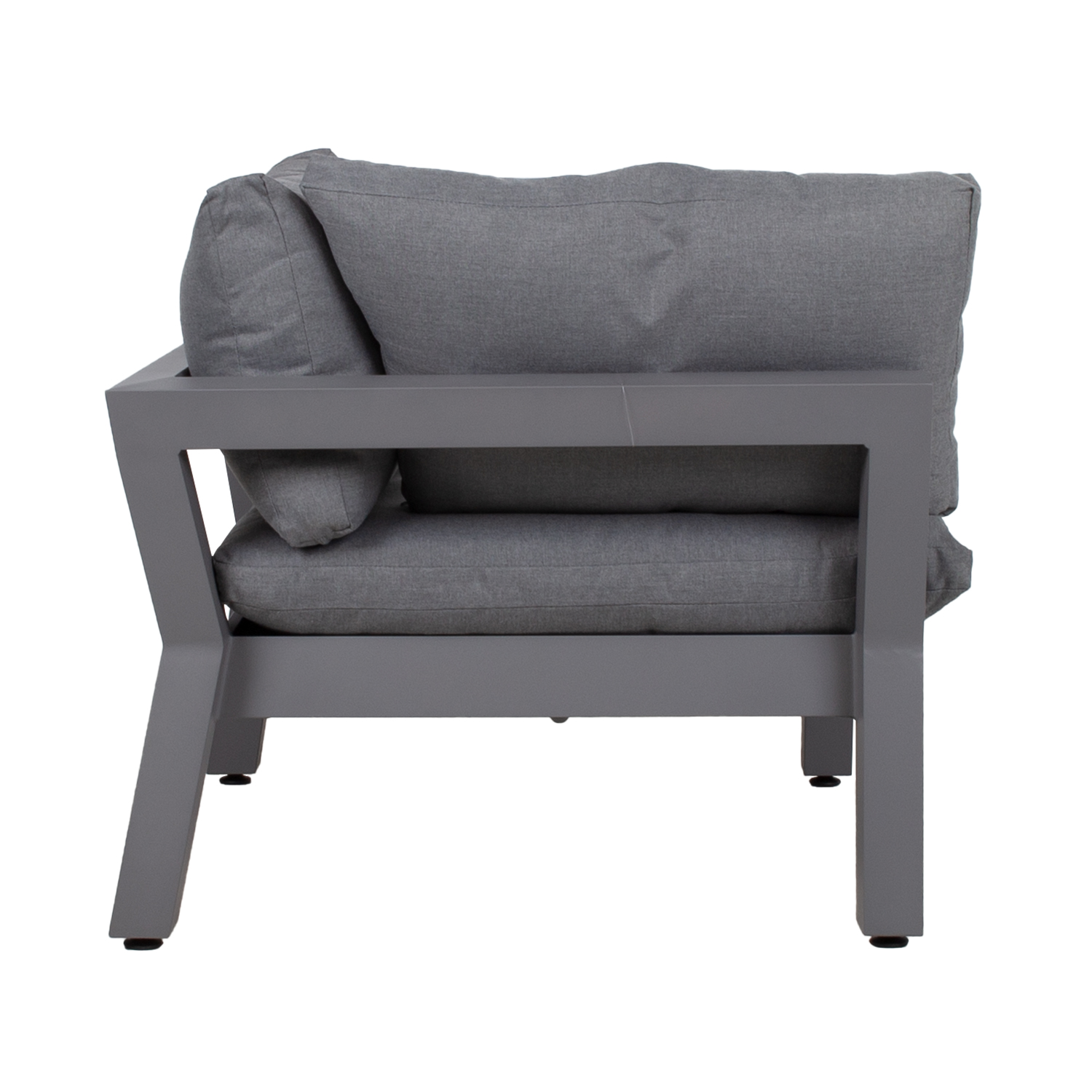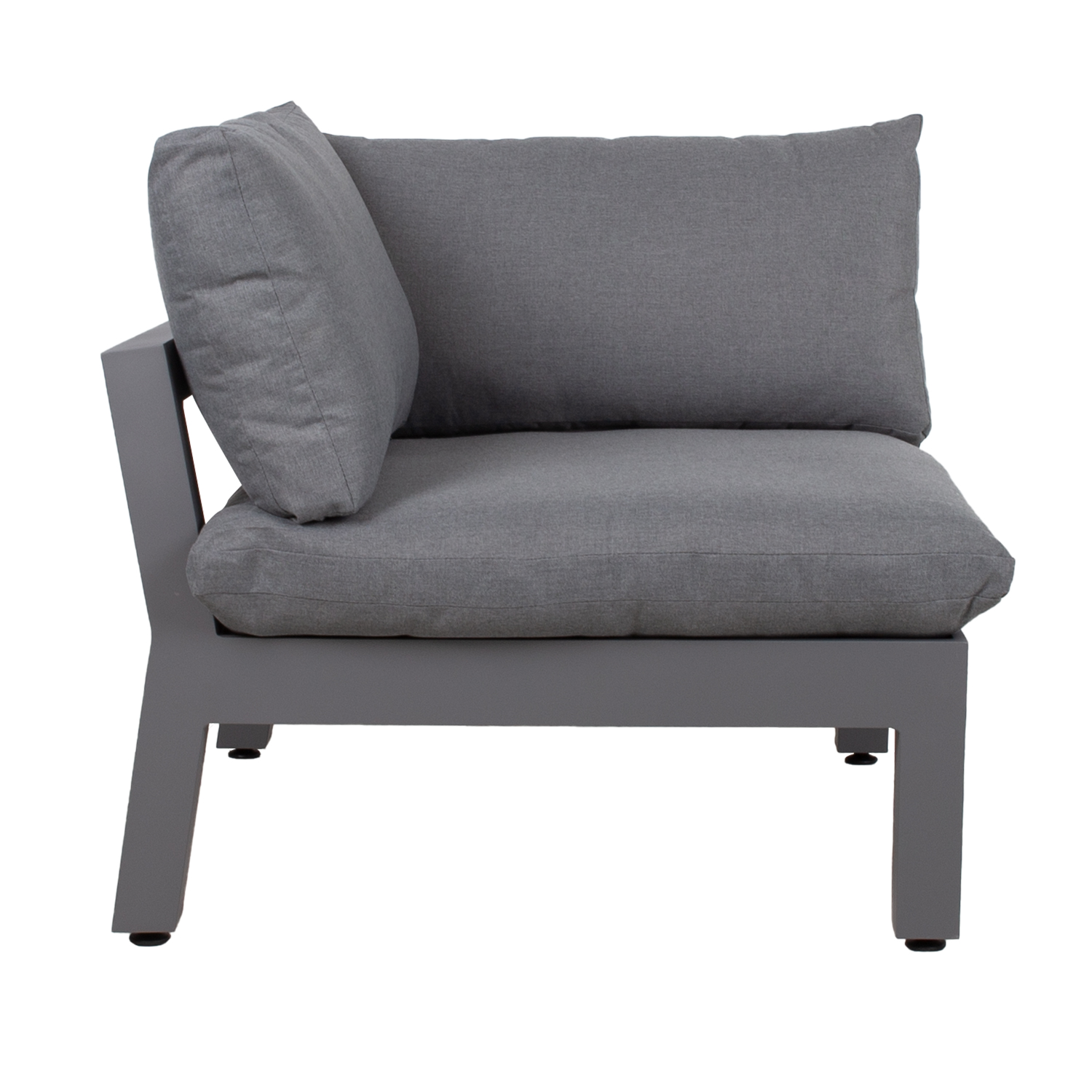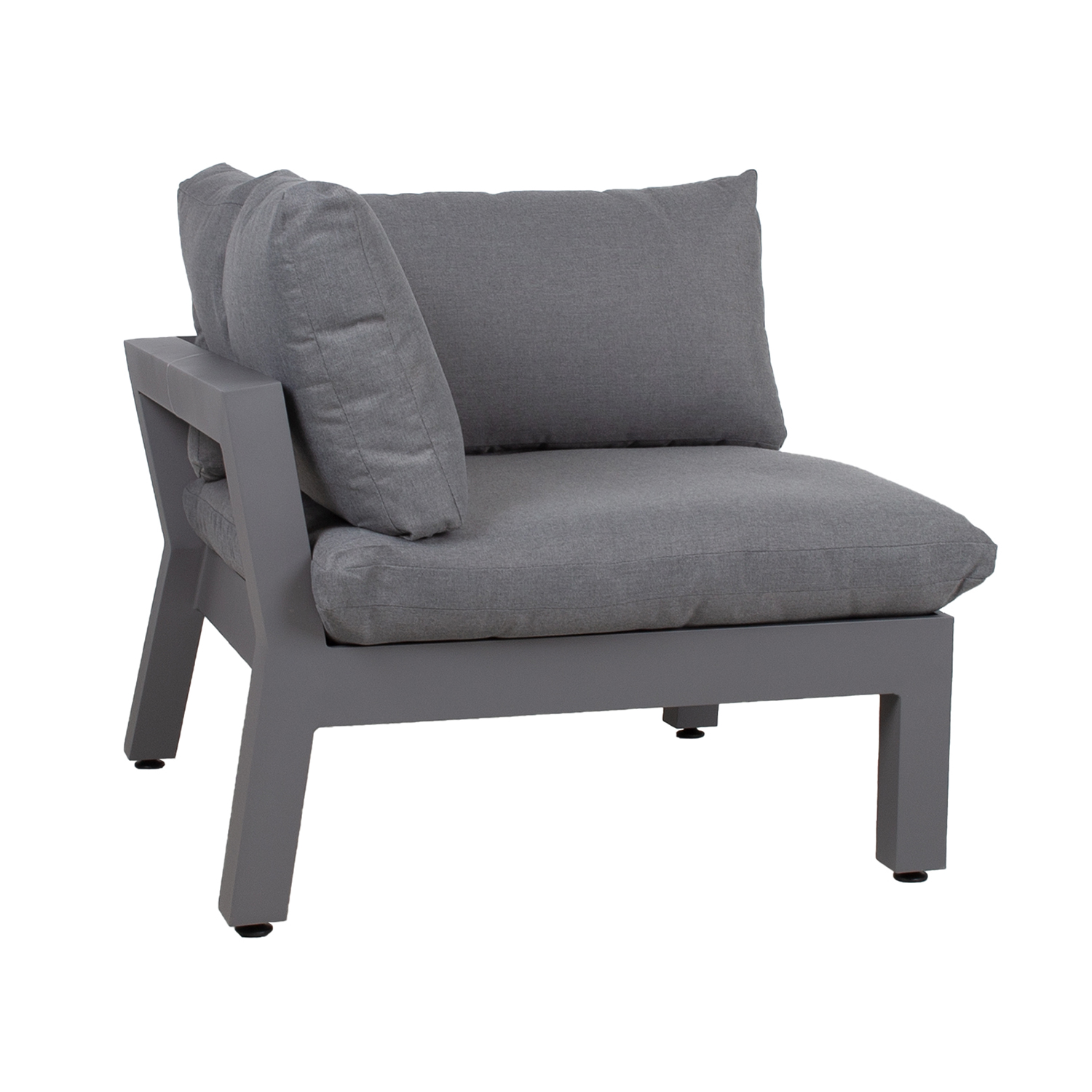 Diivani nurgamoodul FLUFFY 93x93xH66cm, hall. Mooduldiivan on suurepärane võimalus luua sobiva kuju ja suurusega istumiskoht, mida on lihtne muuta ja ümber paigutada. Tooli raam on valmistatud alumiiniumist ja viimistletud halli pulbervärviga. Istmepõhjas on laiad põimitud rihmad, mida katab 3cm poroloonmatt. Paksud ja pehmed padjad ning elastne istmepõhi tagavad suurepärase istumismugavuse. Istme kõrgus raami ääreni on 35cm, koos padjaga 51cm. Istmepadja mõõdud on 87x87xH16cm, seljatoepatjade mõõdud on 87x43x18cm, 72x43x16cm. Padjakatted on valmistatud hallist polüesterkangast. Padjakatted on eemaldatavad ja pestavad. Toode on muutlikes ilmastikutingimustes hästi vastupidav ja lihtsalt hooldatav. Kaitset ilmastikuolude eest vajavad ainult padjad. Hea lahendus patjade igapäevaseks hoiustamiseks ja kuivana hoidmiseks on padjakast. Välitingimustes kasutatava mööbli eluea pikendamiseks soovitame kasutada välimööbli katteid. HOIUSTAMINE: suvehooaja lõppedes soovitame aiamööblit hoiustada siseruumides. Puhastage ja kuivatage mööbel enne hoiule panekut. Kasutage hoiustamiseks kuiva ning hea ventilatsiooniga ruumi.