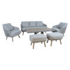 Komplekti kuulub muudetava kõrgusega laud, 3-kohaline diivan, 2 tugitooli ja 2 tumbat.