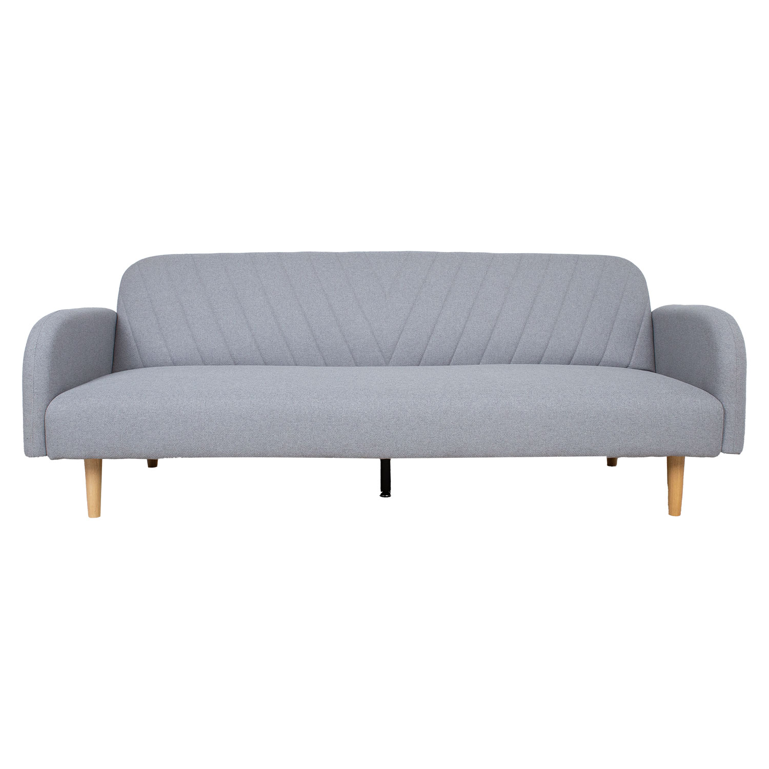 Diivanvoodi KARIN 208x80x80cm, hall. Diivani kattematerjal: 100% polüesterkangas. Karkass ja vedrustus: puit, vineer, MDF, siksak vedrustus. Diivani polstris on kasutatud taaskasutatud porolooni. Diivanil on click-clack mehhanism, mille abil on lihtne muuta diivan magamisasemeks. Diivani üldmõõdud on 208x80xH80cm. Diivanvoodi mõõdud avatuna on 187x105xH41cm. Diivanil on heledad puidust jalad.