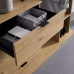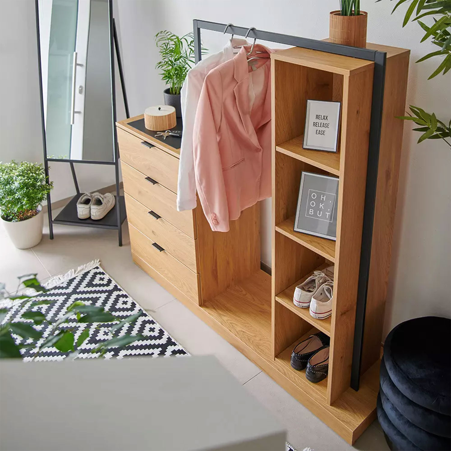Esikumööbel NOVA 145x40xH137cm, tamm/must. Mööbel on valmistatud tammedekooriga melamiinplaadist. Esikus vajaminevate asjade paigutamiseks on 4 sahtlit, 4 avatud riiulit ja stange riiete riputamiseks. Stange on valmistatud metallist ja viimistletud musta pulbervärviga.