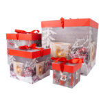 Jõuluteemaline kokkupandav karp kaanega. Pane punane kingipael karbi külje peal olevast august läbi ja tee sõlm paela otsa karbi seespool nii, et pael august läbi ei tuleks. Seo karbikaane peale paelad kinni ilusaks kingituseks.