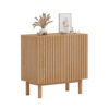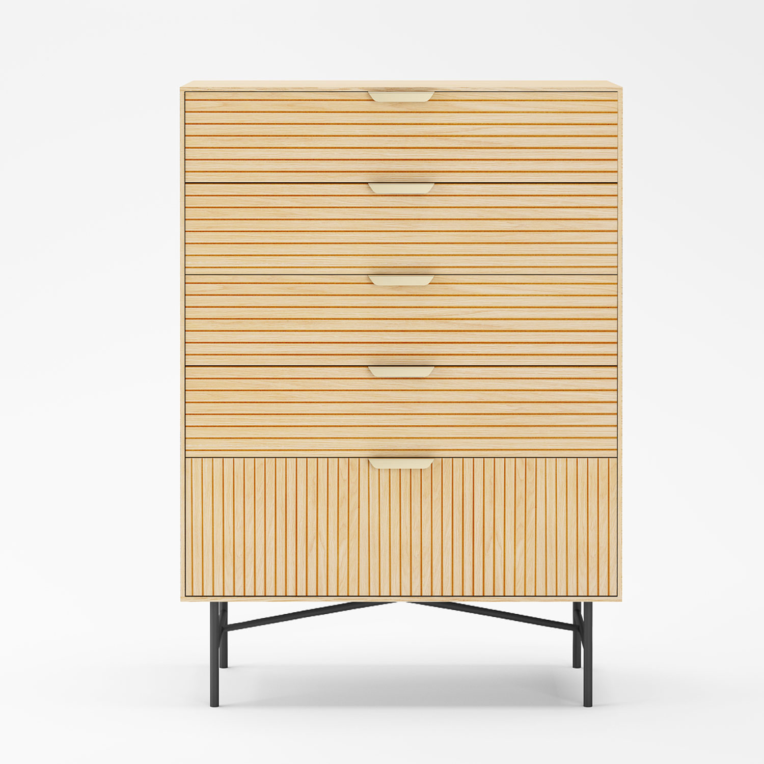 Kummut on valmistatud heleda puidudekooriga melamiinplaadist. Erisuunalised, ribilised esipaneelid ja kuldsed käepidemed annavad kummutile trendika välimuse.