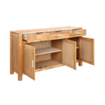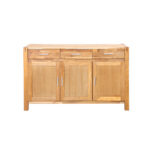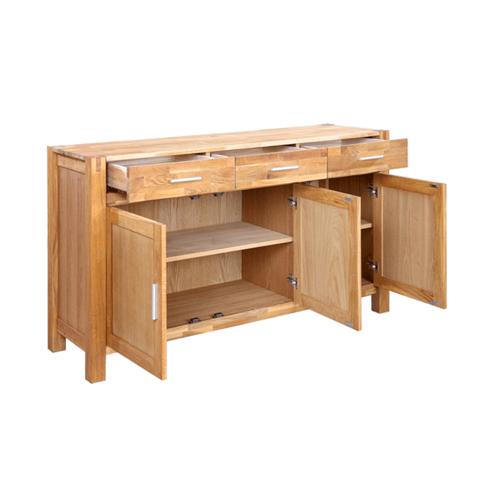 Kummut CHICAGO NEW 140x44xH86cm, tamm. Kummuti karkass on valmistatud täispuidust. Pealmine plaat: 19mm MDF, küljepaneelid ja sahtlite esipaneelid: mööbliplaat. Kummut on kaetud naturaalse tammespooniga. Kummutil on kolm sahtlit ja 3 ust. Kappide sees on üks vaheriiul. Uste ja sahtlitel on alumiiniumist hõbedased käepidemed.