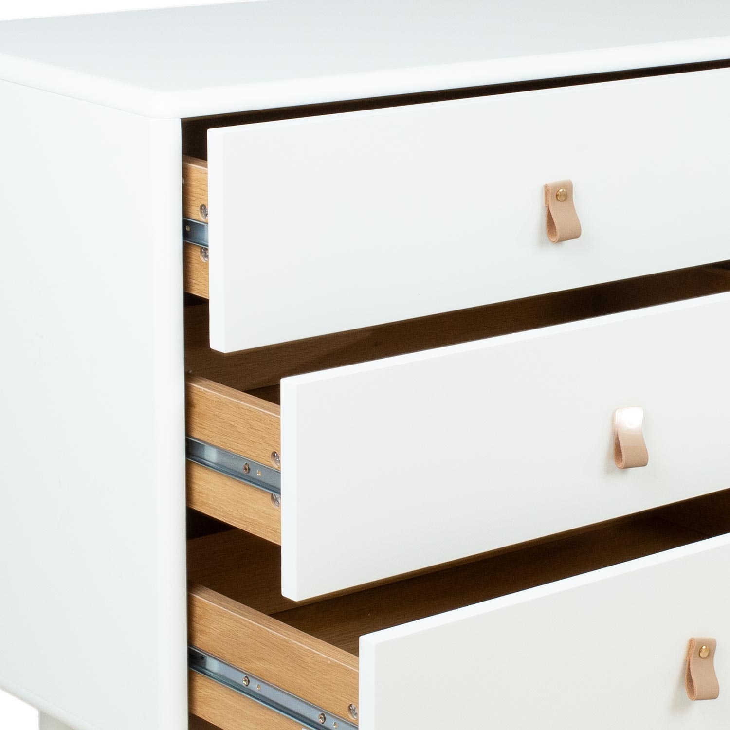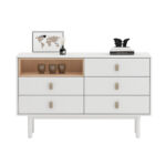 Kummut IRIS 5-sahtli ja riiuliga 120x40xH75cm, valge. Kummut on valmistatud 18mm MDF plaadist. Jalad ja alusraam on valmistatud täispuidust. Kummut on viimistletud vastupidava polüuretaanvärviga. Sahtlitel on nahast käepidemed. Avatud vaheriiul on vooderdatud heleda puiduvärvi plaadiga. Kummutil on ümarad välisservad.