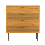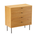 Kummut LINE 4-sahtliga 80x40xH85cm. Kummut on valmistatud tammedekooriga melamiinplaadist. Efektsed reljeefse pinnaga triibulised sahtlite esipaneelid on valmistatud mustast MDF plaadist, mida kaunistavad tammevärvi kitsad liistud. Kummuti metallist jalad on viimistletud musta pulbervärviga.