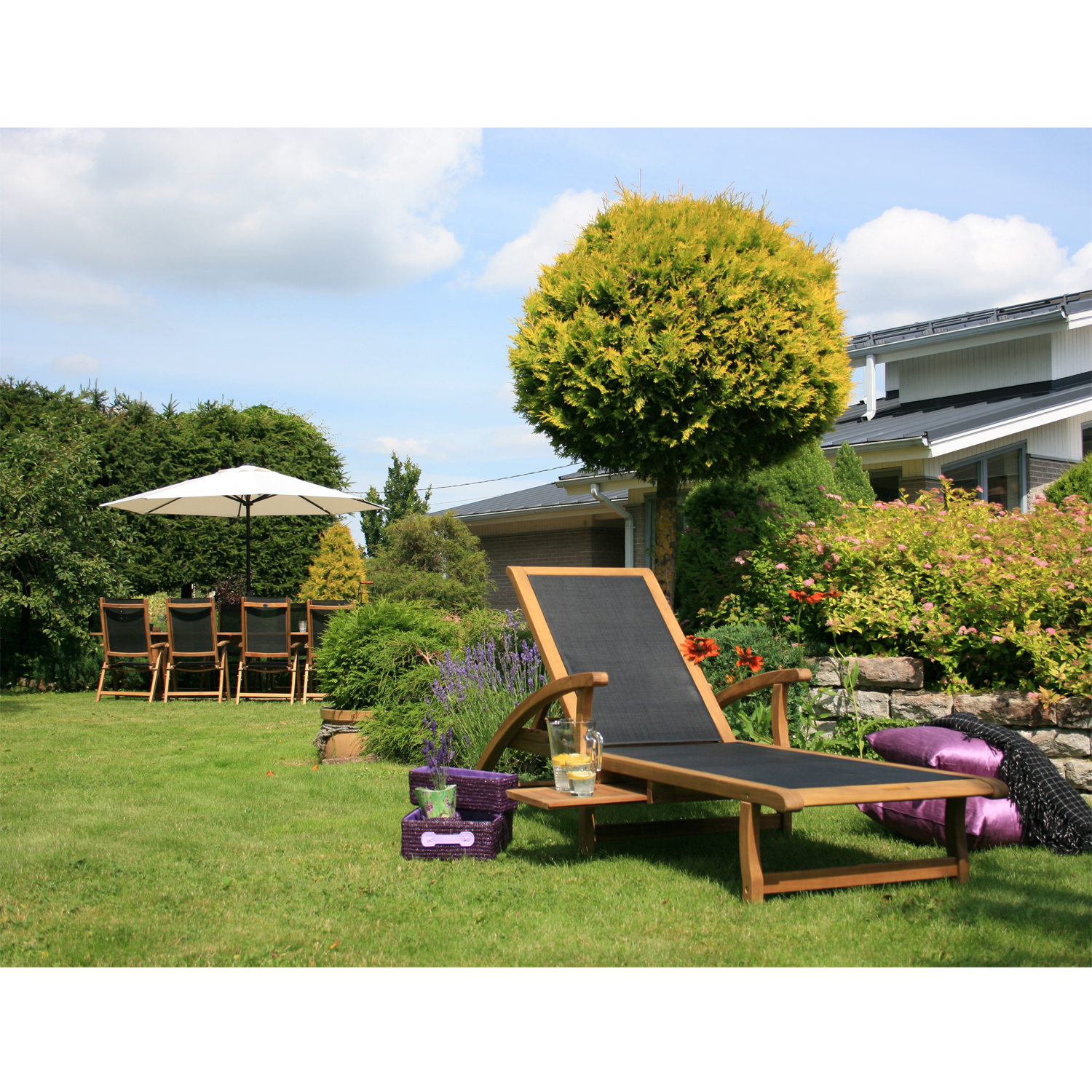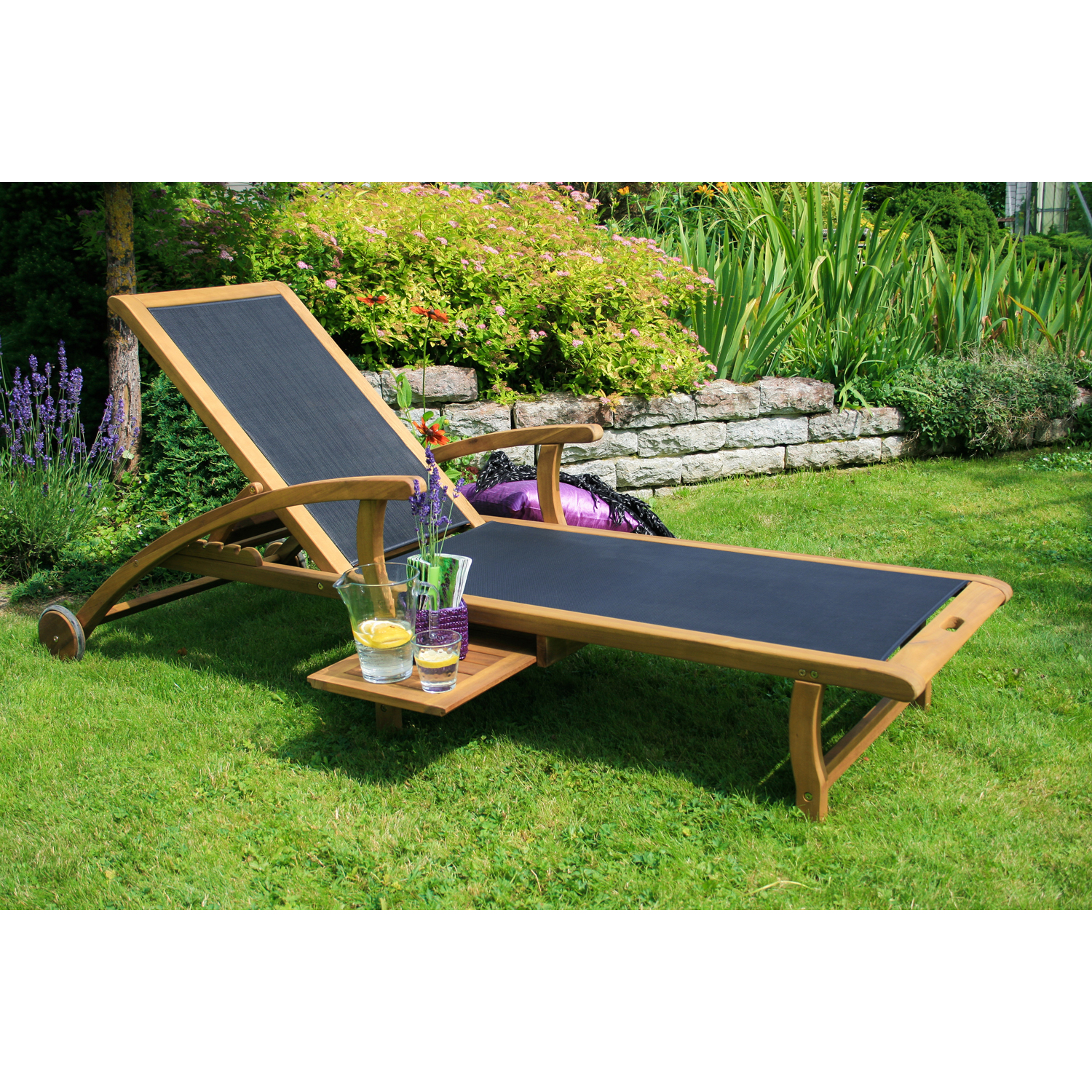 Lamamistool FUTURE 75x198xH52cm, must. Lamamistooli kasutamine muudab suvepäikese nautimise lõõgastavaks ja mugavaks. Tooli raam on valmistatud akaatsia puidust ja viimistletud tiikpuu toonis puidukaitseõliga. Must textilene iste laseb hästi õhku läbi ja kuivavad kiiresti ja on lihtsalt hooldatav. Lamamistooli seljatugi on reguleeritav viies positsioonis. Lamamistooli alla paigutatud abilaua võib välja tõmmata vasakule või paremale poole. Laua mõõdud on 30x28cm. Tooli istme laius 60cm, istme pikkus 113cm, istme kõrgus 30cm. Seljatoe laius 50cm, seljatoe pikkus 82cm. Kaalupiirang on 100kg. HOOLDUS: puit on elav looduslik materjal, mille välisilme ilmastikutingimuste mõjul muutub. Puhastage mööblit regulaarselt, kaitske liigniiskuse ja UV kiirguse eest. Kerge lihvimine ja uus õlikiht vähemalt korra aastas on piisav värskenduskuur mööblile jälle uue näo andmiseks. HOIUSTAMINE: suvehooaja lõppedes soovitame aiamööblit hoiustada siseruumides. Puhastage ja kuivatage mööbel enne hoiule panekut. Kasutage hoiustamiseks kuiva ning hea ventilatsiooniga ruumi.