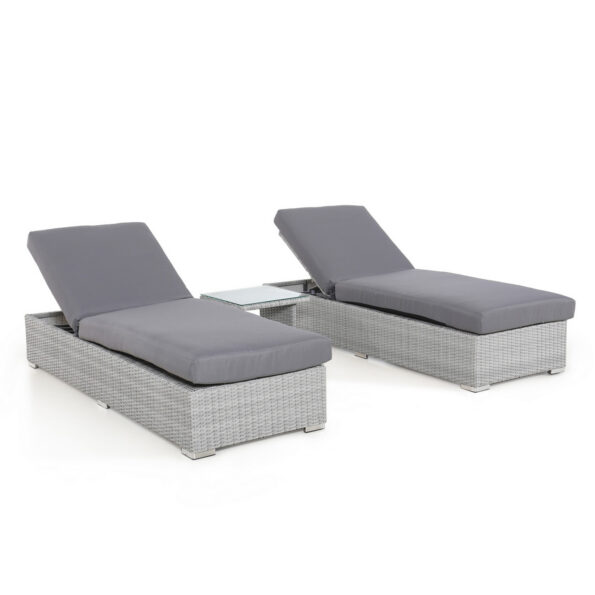 Komplekti kuuluvad 2 lamamistooli koos pehmete patjadega ja abilaud.
