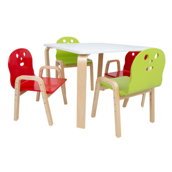 Lastekomplekt HAPPY laud ja 2 tooli, valge/punane/roheline. Laua mõõdud on 75x75xH50cm. Materjal: paplivineer kasespooniga. Lauaplaat on värvitud valgeks. Painutatud vineerist jalad on viimistletud naturaalse lakiga. Tool HAPPY kasvab koos teie lapsega! Istme kõrgust on võimalik tõsta neli korda vastavalt lapse kasvule – 21/25,5/30/34,5cm. Tooli üldmõõdud on 39x36xH46,5/51/55,5/60cm. Istme laius 33cm, istme sügavus 31cm, seljatoe kõrgus 27cm, käetoe kõrgus maast 36cm. Materjal: painutatud paplivineer kasespooniga. Istmed on värvitud punaseks ja roheliseks, jalad ja raam on viimistletud naturaalse lakiga. Kaalupiirang 40kg.