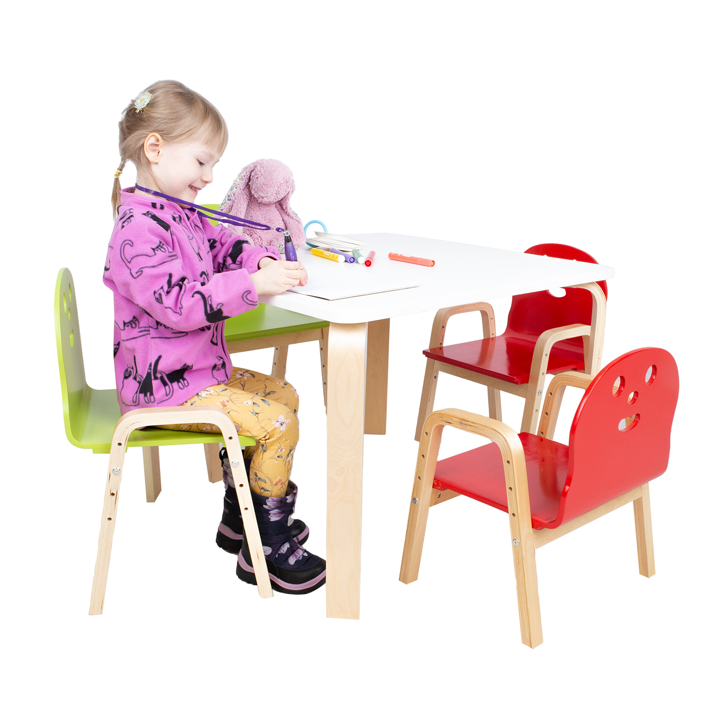 Lastekomplekt HAPPY laud ja 2 tooli, valge/punane/roheline