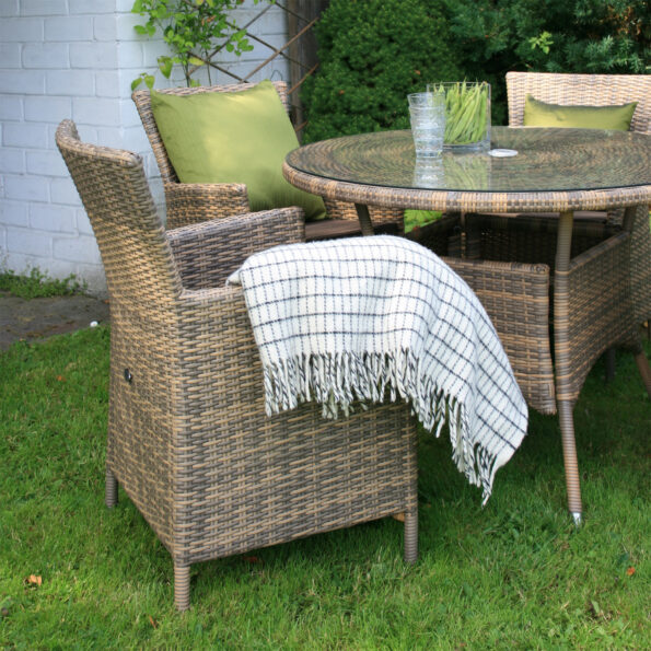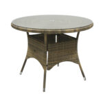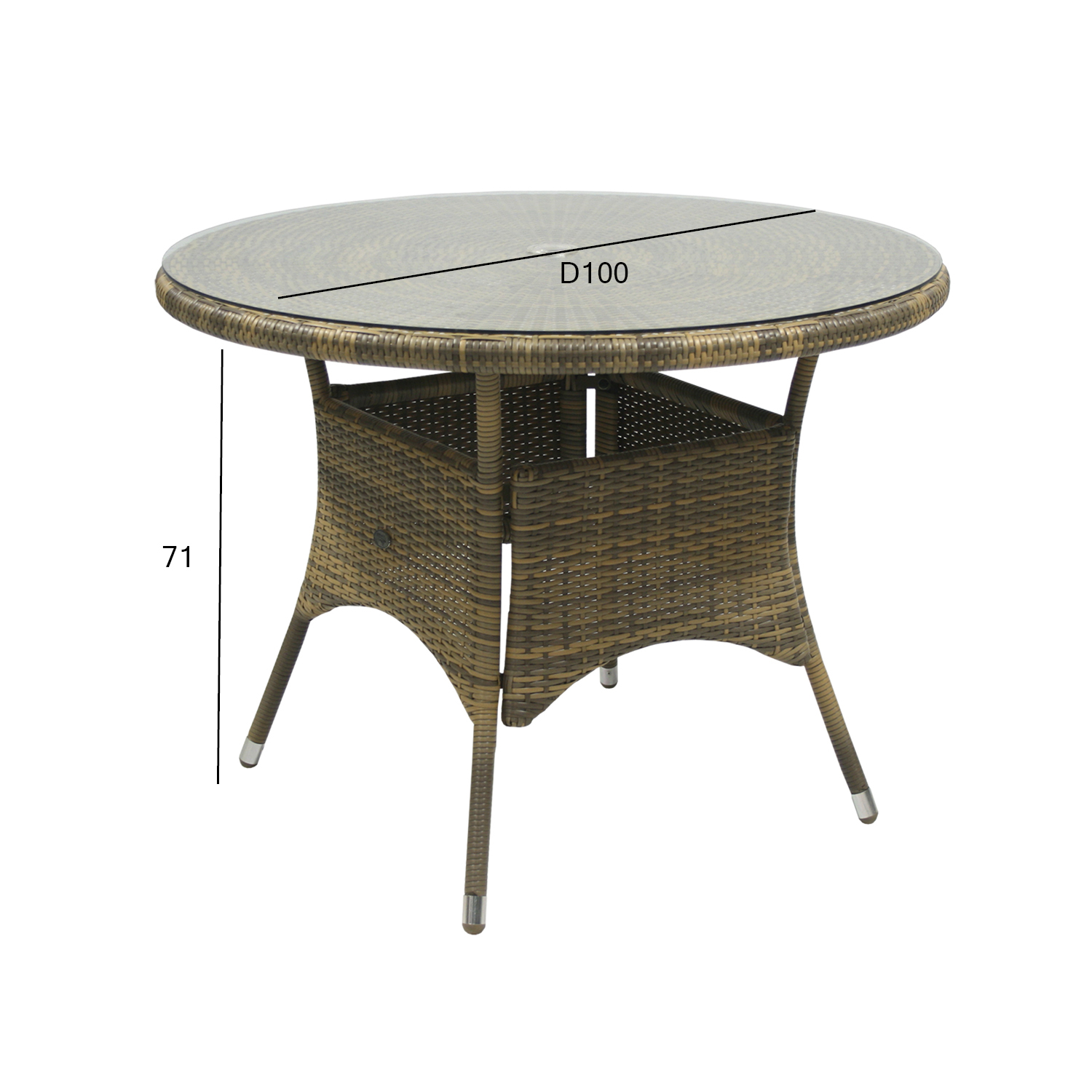 Laud WICKER D100xH71cm, cappuccino. Lauaplaat: 5mm läbipaistev karastatud klaas. Laua pulbervärvitud alumiiniumraam on kaetud plastikpunutisega. Laua keskel on päikesevarjuauk D4cm. Toode on muutlikes ilmastikutingimustes hästi vastupidav ja ei nõua erilist hooldust. Välitingimustes kasutatava mööbli eluea pikendamiseks soovitame kasutada välimööbli katteid. HOIUSTAMINE: suvehooaja lõppedes soovitame aiamööblit hoiustada siseruumides. Puhastage ja kuivatage mööbel enne hoiule panekut. Kasutage hoiustamiseks kuiva ning hea ventilatsiooniga ruumi.