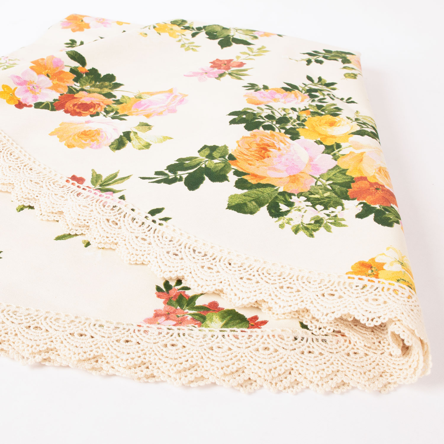 Laudlina HOLLY pitsiga, D170cm, heledad roosid, 20% polüester, 80% puuvill, kangas 495. HOOLDUS: võib pesta temperatuuril 30 kraadi pesumasinas.