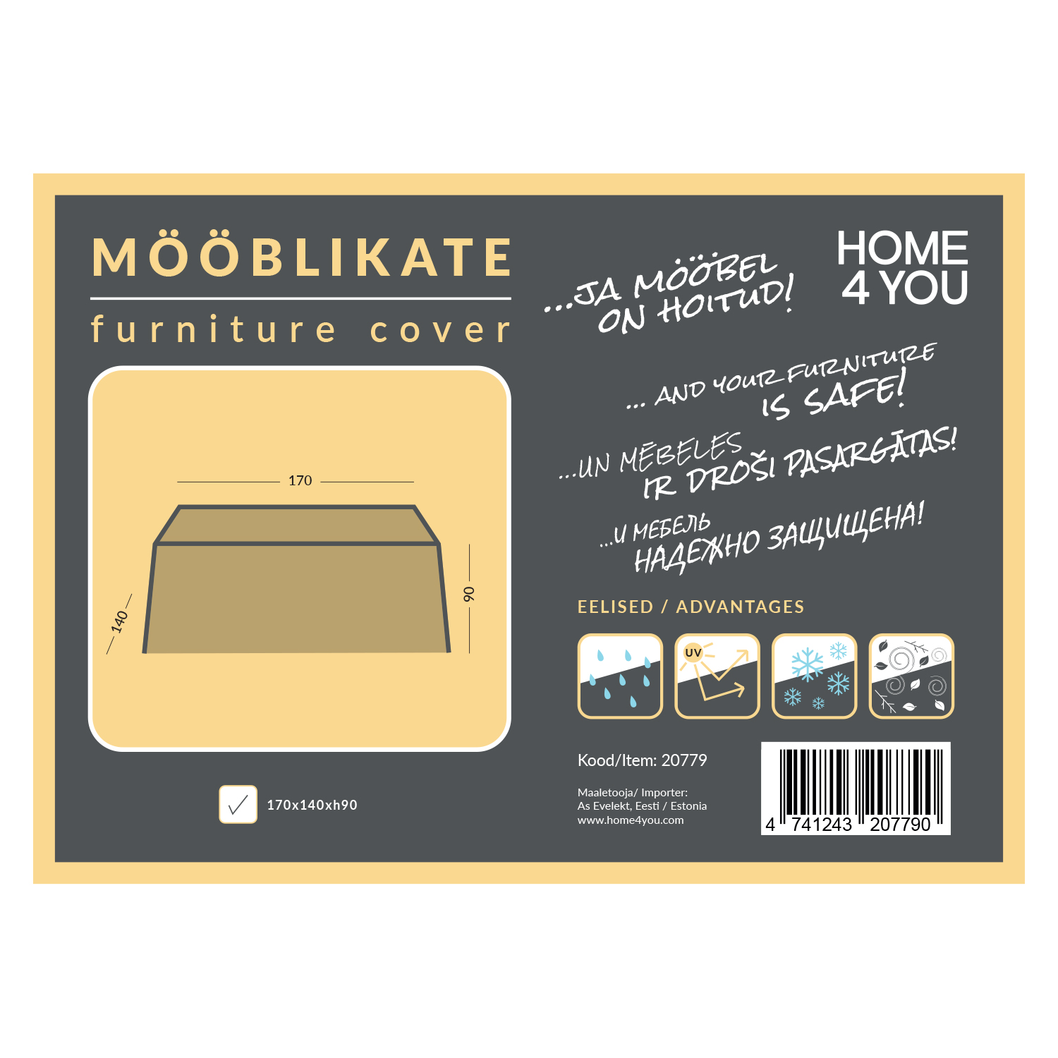 TÄHELEPANU! Mööblikate aitab pikendada mööbli eluiga ning on turvaline kaitse välimööblile, kuid ei taga samasuguseid tingimusi nagu siseruumides hoiustamine. Tugeva vihma korral võivad kattega kaetud mööblile koguneda veelombid. Eemaldage kogunenud vesi esimesel võimalusel. Peske katet vastavalt tootele kinnitatud hooldusjuhendile. Mööblikatte kasutamine ei ole sobiv lahendus aiamööbli ületalve õues hoidmiseks.