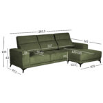 Nurgadiivan DARLA. Diivan on kaetud vastupidava polüesterkangaga, 400g/m², Oeko-Tex standard. Kattematerjali kulumiskindlus: 50000 Martindale’i. Diivanil on siksak vedrustus. Diivani konstruktsioon on valmistatud puidust, vineerist, OSB-plaadist, puitlaast- ja puitkiudplaadist. Diivanijalad on valmistatud metallist. Istme kõrgus on 44cm, istme sügavus on 61/81cm, istmeosa laius on 227cm. Käetugede kõrgus on 63cm ja laius 26cm. Jalgade kõrgus on 13.5cm. Toote mõõdud on 281,5×97,5/161xH104cm. HOOLDUS: puhastamiseks kasutage tolmuimejat. Kõik plekid või mustus tuleb viivitamatult puhastada neutraalse seebilahusega, hõõrudes lapiga sujuvate ringjate liigutustega.