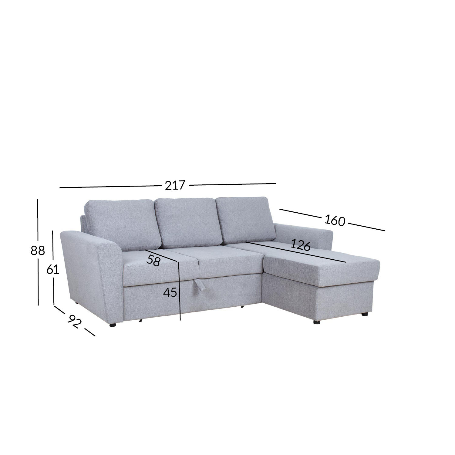 Diivani üldmõõdud on 217×92/160xH88cm. Diivani kõrgus raami ääreni 73cm. Istme laius 123+56cm, istme sügavus 58/126cm.Istme kõrgus 45cm. Seljatoepadja mõõdud on 60x45x18cm. Magamisosa mõõdud avatuna 137x179cm.