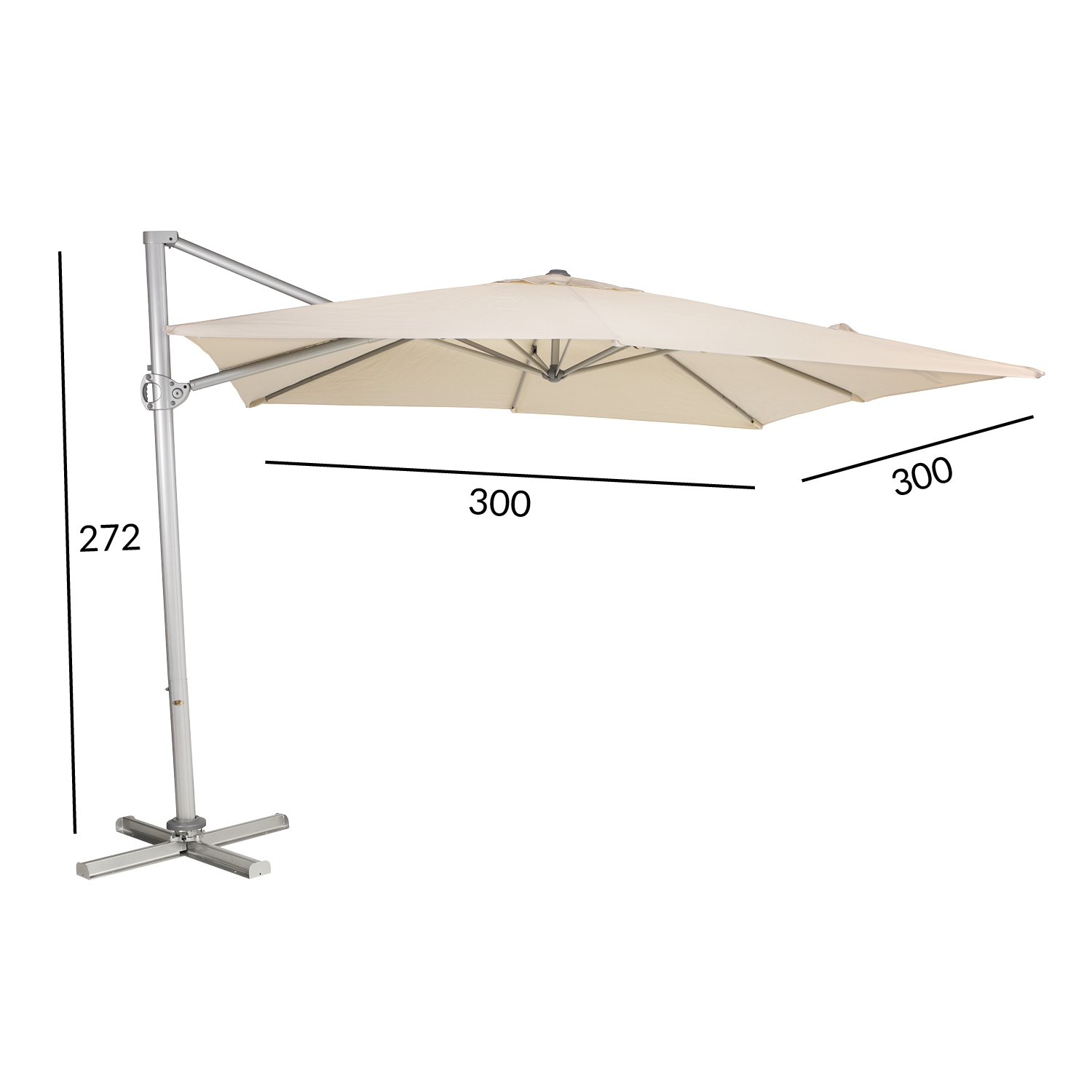 Päikesevari ROMA 3x3xH2,72m, bee˛. Päikesevarju kate on valmistatud bee˛ist polüesterkangagast 180g/m². Varjul on 8 terasribi 27x15mm/24x12mm. Alumiiniumist jalg koosneb kahest torust 80x53x2mm. Jalg ja ribid on kaetud hõbedase pulbervärviga. Vari on vändaga avatav ja ümber telje pööratav. Komplekti kuulub metallist alusrist ilma lisaraskuseta. Lisaraskuseks soovitame päikesevarjualuse kive koodiga 11786 või 25188. HOIATUS: toode ei ole mõeldud kasutamiseks tugeva tuule või vihma korral. Ärge jätke avatud päikesevarju järelevalveta. HOOLDUS: hoiustage kuivas, hea ventilatsiooniga ruumis. Enne päikesevarju hoiule panemist laske sel täielikult kuivada.