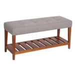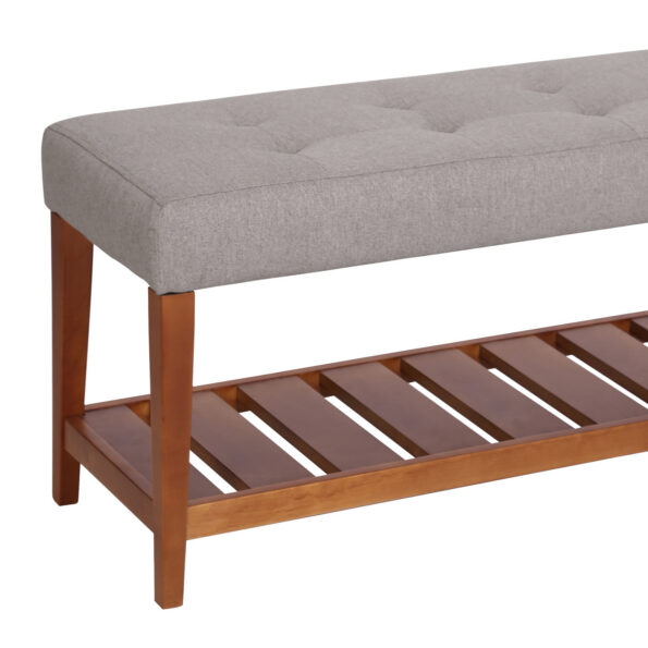 Pink BRIGITA helepruun. Mugav iste on kergelt polsterdatud ja kaetud helepruuni kangaga. Kattematerjal: 100% polüester, Martindale 25 000. Istme karkass: metall ja vineer. Polsterdus: polüuretaanvaht. Raam on täispuidust kask. Pingil on riiul, kuhu jalanõusid asetada. Kaalupiirang 100kg.