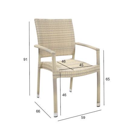Tool WICKER-3 käetugedega, bee˛. Klassikaline plastikpunutisega aiatool on mugav, vastupidav ja ilmastikukindel ning sobib hästi nii koduaeda kui kohvikusse. Tool on kombineeritav teiste WICKER MIX&MATCH sarja toodetega. Tooli tugev ja stabiilne alumiiniumraam on kaetud plastikpunutisega. Toolid on virnastatavad ning nende hoiustamine on lihtne ja ruumi säästev. Plastikpunutis ei vaja spetsiaalset hooldust. Tooli üldmõõdud on 59x66xH91cm. Istme laius 45cm, istme sügavus 46cm, istme kõrgus 46cm. Seljatoe kõrgus 51cm. Käetoe kõrgus maast 65cm. Kaalupiirang 100kg. HOIUSTAMINE: suvehooaja lõppedes soovitame aiamööblit hoiustada siseruumides. Puhastage ja kuivatage mööbel enne hoiule panekut. Kasutage hoiustamiseks jahedat, kuiva ning hea ventilatsiooniga ruumi.