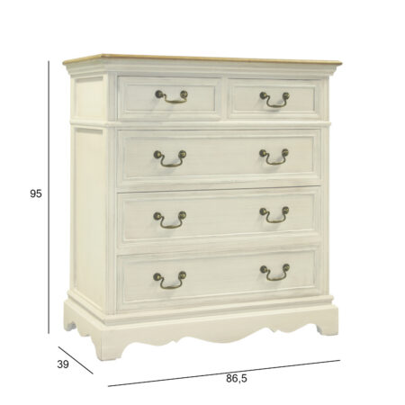 Kummut SAMIRA 5-sahtliga 86,5x39xH95cm, antiikvalge/naturaalne. Kummuti põhikonstruktsioon ja sokkel on valmistatud saarepuidust, MDF küljepaneelid. Kummut on viimistletud antiikvalge värviga. Kummuti pealmine MDF plaat on kaetud naturaalse paulownia spooniga. Metallist käepidemetega sahtlid on ilma siinideta.