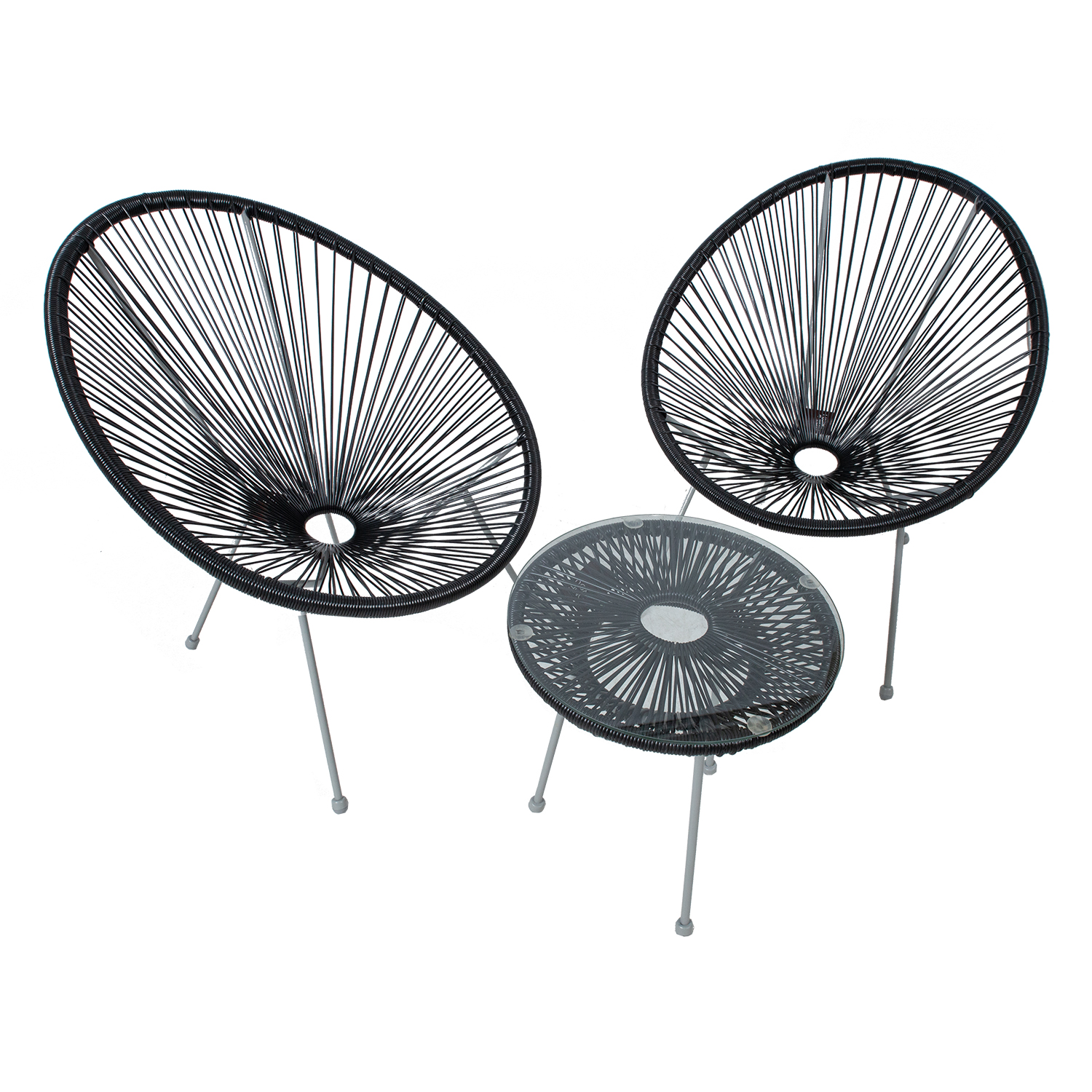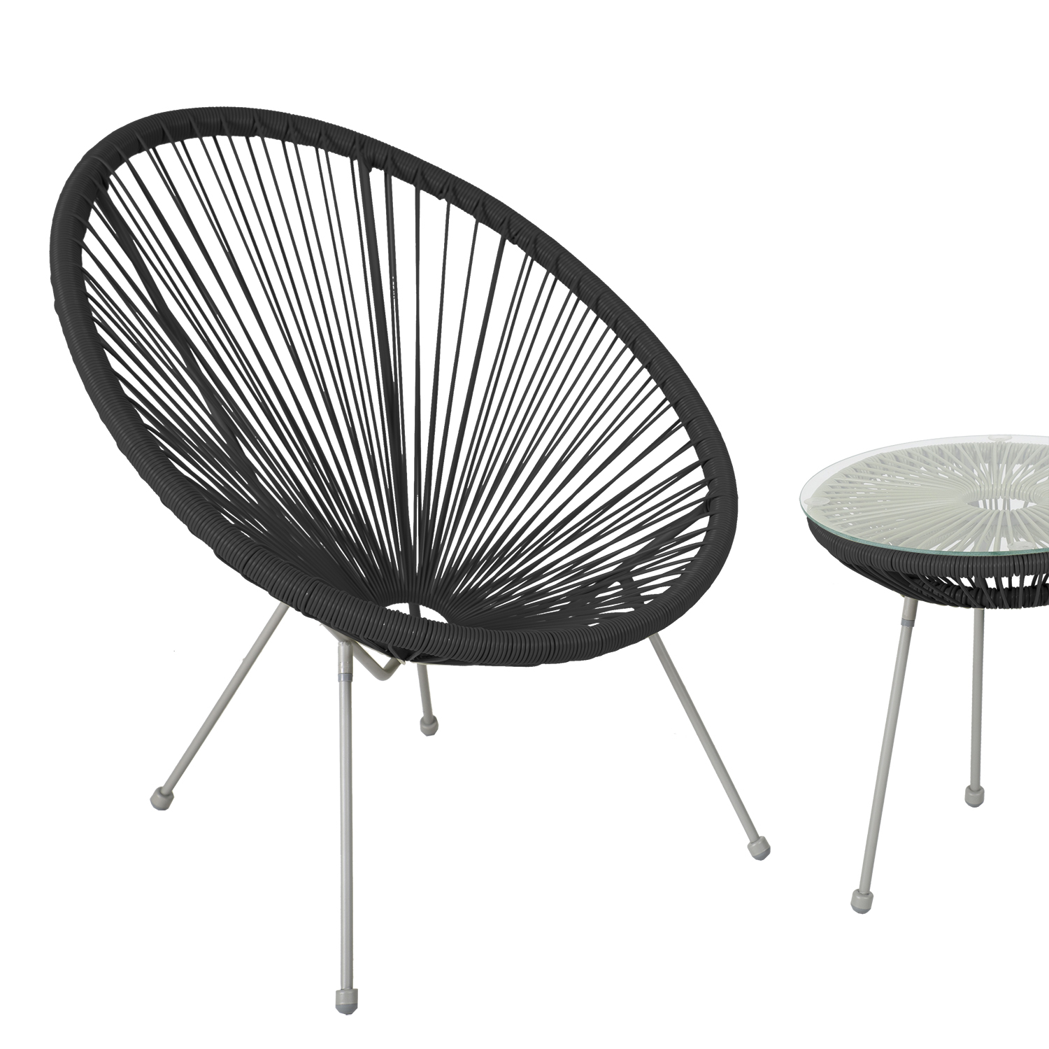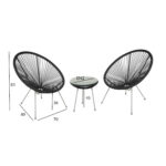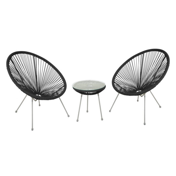 Rõdukomplekt COMO laud ja 2 tooli, must. Helehall terasraam musta plastikpunutisega. Läbipaistev karastatud klaasist lauaplaat. Mõõdud: laud D42xH45cm, tool 70x80xH36/83cm.