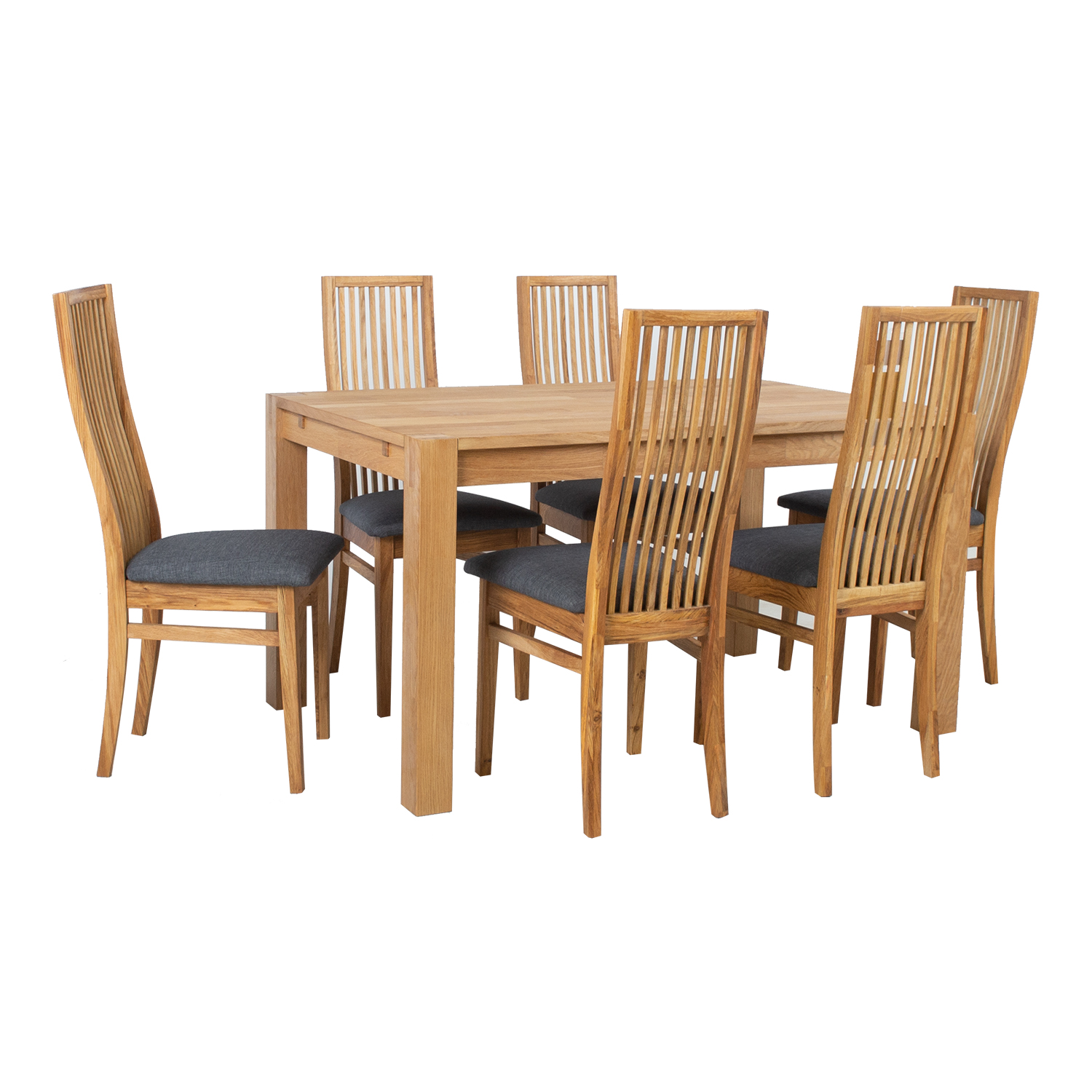 Söögilauakomplekt CHICAGO NEW laud ja 6 tooli. Laua mõõdud on 140x90xH76cm. Lauaplaat: MDF naturaalse tammespooniga. Lauajalad ja -raam on valmistatud madalama klassi täispuidust ja kaetud tammespooniga. Lauajala mõõdud on 8x8cm. Laud on viimistletud puiduõliga. Tooli mõõdud on 46x56xH103cm, istme kõrgus 47cm. Tooli jalad ja raam on valmistatud täistammepuidust ja õlitatud. Polsterdatud iste on kaetud halli polüesterkangaga. Kaalupiirang 100kg. Lauale on võimalik juurde osta pikendus 45x90cm koodiga 84026. Pikendus on võimalik paigaldada laua mõlemasse otsa. HOOLDUS: naturaalse spooniga kaetud lauaplaat on väga tundlik niiskuskahjustuste ja temperatuuri suhtes. Kasutage alati lauanõude all alusmatte ja kuumaaluseid. Igasugune lauale sattunud vedelik tuleb koheselt kuivatada pehme lapiga. Vältige liigset hõõrumist ja abrasiivseid puhastusvahendeid.