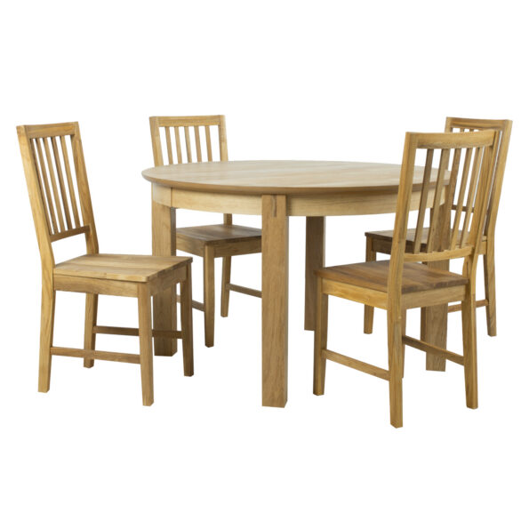 Söögilauakomplekt CHICAGO NEW ümmargune laud ja 4 tooli. Pikendatava söögilaua mõõdud on D120/160x120xH75cm. Lauaplaat: MDF kaetud naturaalse tammespooniga. Lauajalad (8x8cm) ja raam on valmistatud täispuidust ja kaetud naturaalse tammespooniga. Laud on viimistletud puiduõliga. Laud on keskelt pikendatav. Laua pooled liiguvad metallsiinidel. Tooli mõõdud on 43x42xH94cm. Tool on valmistatud täistammepuidust ja viimistletud puiduõliga. Kaalupiirang 120kg. HOOLDUS: naturaalse spooniga kaetud lauaplaat on väga tundlik niiskuskahjustuste ja temperatuuri suhtes. Kasutage alati lauanõude all alusmatte ja kuumaaluseid. Igasugune lauale sattunud vedelik tuleb koheselt kuivatada pehme lapiga. Vältige liigset hõõrumist ja abrasiivseid puhastusvahendeid.