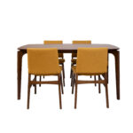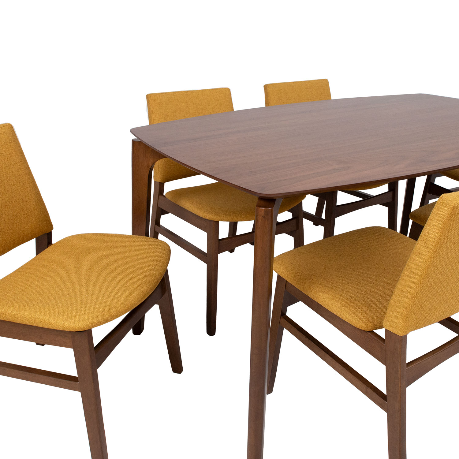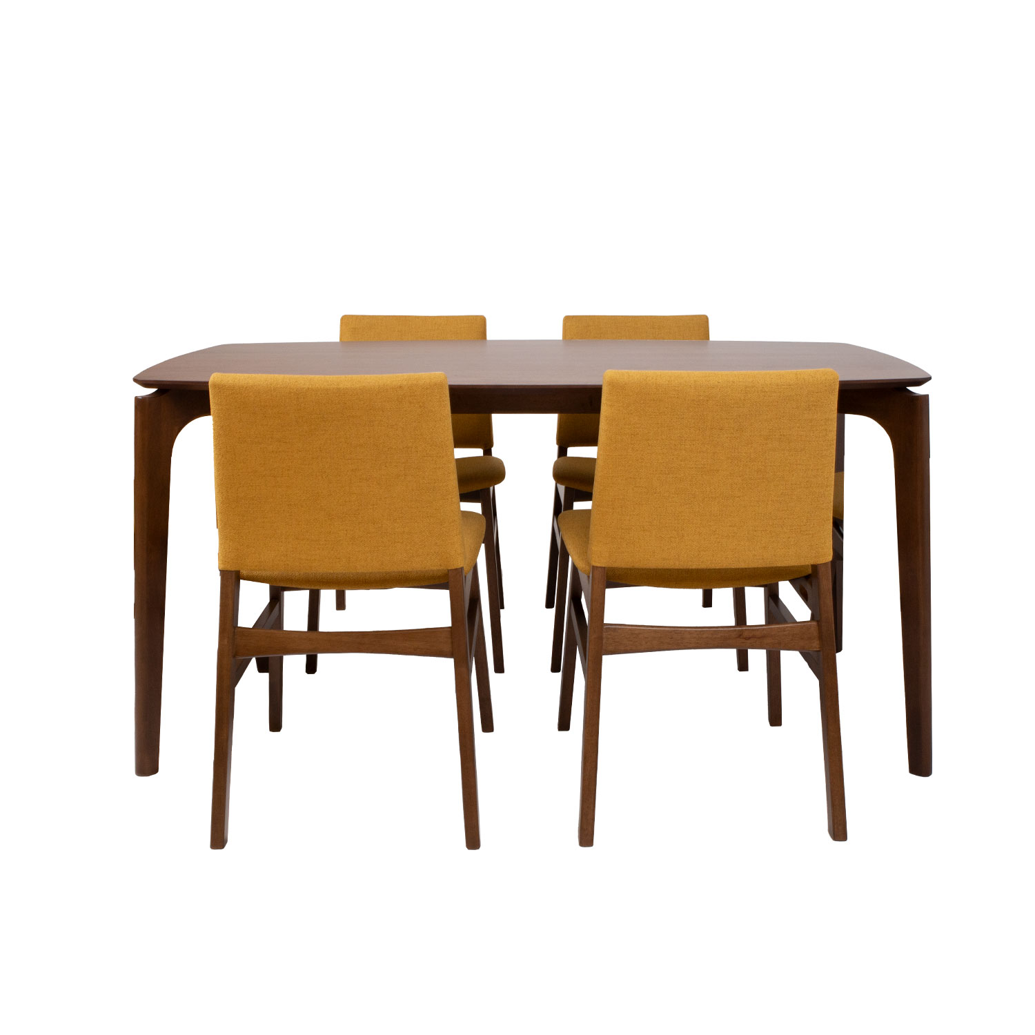 Söögilauakomplekt HAYDIE 4-tooliga. Söögilaua mõõdud on 150x90xH75cm. Lauaplaat: 18mm MDF naturaalse pähklispooniga. Jalad on valmistatud kummipuust. Laud on viimistletud pähkli tooni lakiga. Tooli mõõdud on 46x57xH79cm. Tooli iste ja seljatugi on kergelt polsterdatud ja kaetud kollase polüesterkangaga. Tooli jalad ja raam on valmistatud kummipuust ja viimistletud pähkli tooni lakiga. Kaalupiirang 120kg.