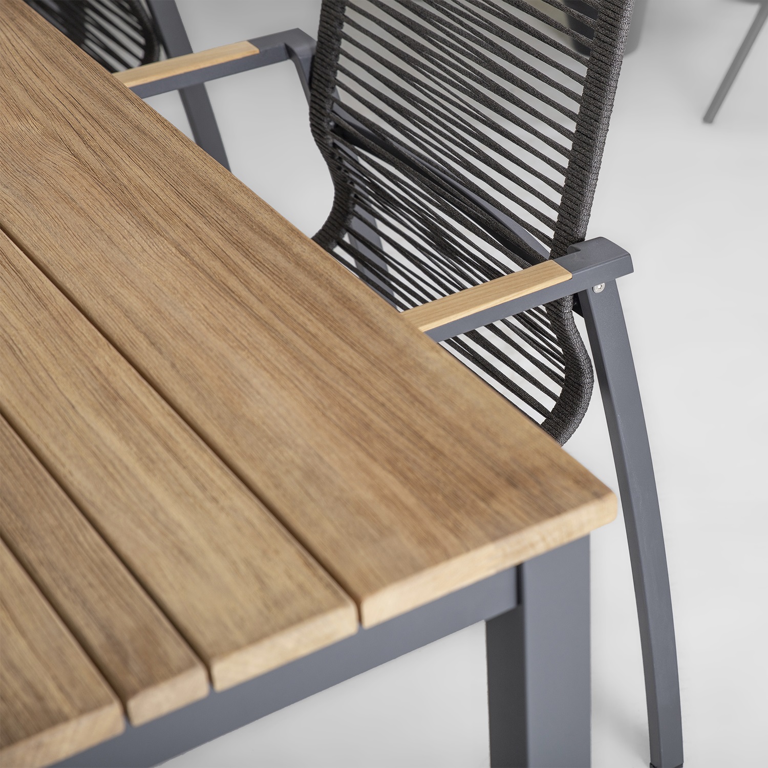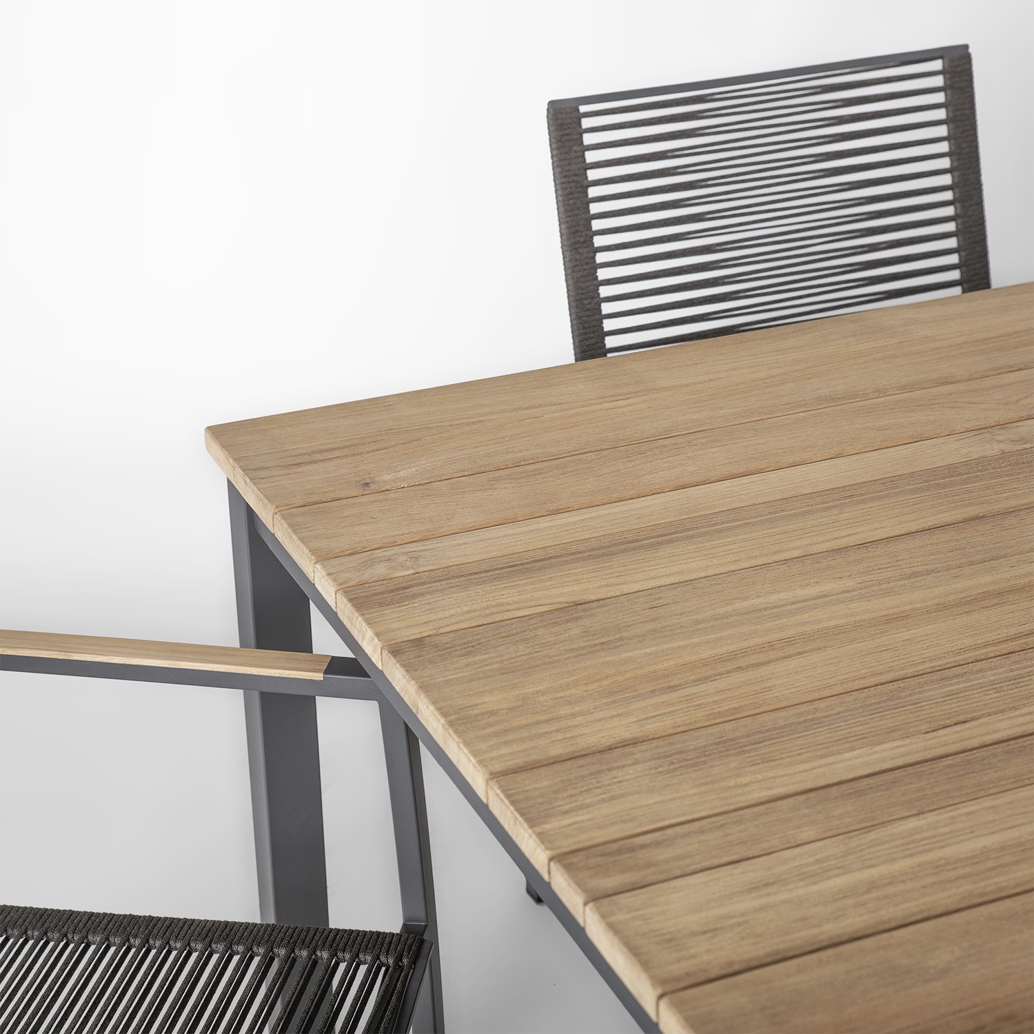 Söögilauakomplekt MONTANA laud ja 8 tooli. Laua mõõdud on 220x100xH76cm. Lauaplaat on valmistatud A-klassi tiikpuust. Peenlihvitud pind on täielikult naturaalne oma looduslikus ilus ning seda ei ole õlitatud ega muul viisil keemiliselt töödeldud. Laua jalad ja alusraam on valmistatud roostevabast terasest ja viimistletud halli pulbervärviga. A-klassi tiikpuu on täiuslik looduslik materjal luksusliku õuemööbli valmistamiseks. Puidu süü on tihe ja ühtlane ning kauni sametise läikega, värvus on kuldse nisu-ja meetoonides. Tänu suurele looduslike õlide sisaldusele on tiikpuu väga vastupidav niiskuse ning puidukahjurite suhtes. Tiikpuu talub väga hästi erinevaid ilmastikutingimusi ja säilitab oma suurepärase välimuse ja parimad omadused pikkadeks aastateks. Päikesevalguse ja niiskuse mõjul muutub laua pind aja jooksul kaunilt hõbehalliks. Selline värvimuutus on loomulik ning ei mõjuta puidu kvaliteeti. Eksklusiivne tiikpuust laud sobib hästi ka siseruumides kasutamiseks. Tooli roostevabast terasest raam on viimistletud halli pulbervärviga. Iste ja seljatugi on kaetud nöörpunutisega. Käetugesid kaunistavad naturaalsest tiikpuust liistud. Toolid on virnastatavad ning nende hoiustamine on lihtne ja ruumi säästev. Tooli üldmõõdud on 60x61xH90cm, istme kõrgus 45cm, istme laius 48cm, istme sügavus 48cm, seljatoe kõrgus 48cm, käetoe kõrgus maast 65cm. Kaalupiirang 120kg. Toode on muutlikes ilmastikutingimustes vastupidav ja lihtsalt hooldatav. Välitingimustes kasutatava mööbli eluea pikendamiseks soovitame kasutada välimööbli katteid. HOIUSTAMINE: suvehooaja lõppedes soovitame aiamööblit hoiustada siseruumides. Puhastage ja kuivatage mööbel enne hoiule panekut. Kasutage hoiustamiseks kuiva ning hea ventilatsiooniga ruumi.