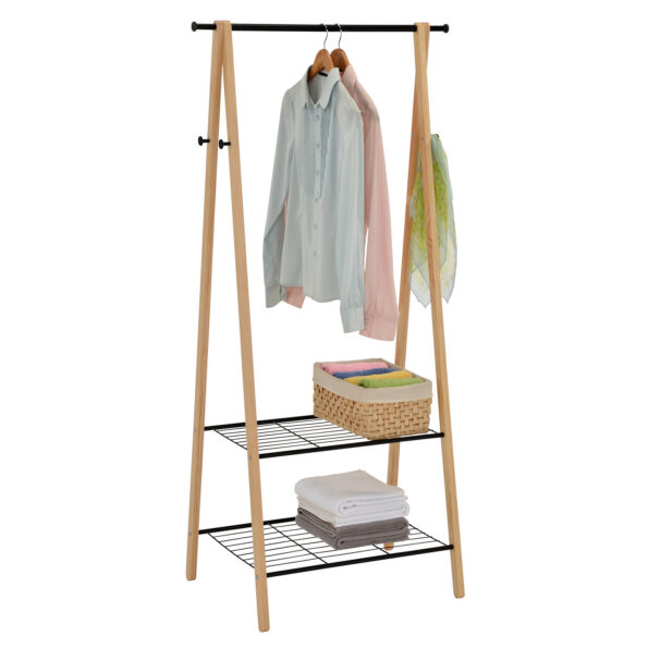 Stange FOREST 2-riiuli ja 4-nagiga 79x45xH155cm, materjal: männipuit/teras, värvus: naturaalne/must. Kaalupiirang: stange 10kg, riiulid 8kg.
