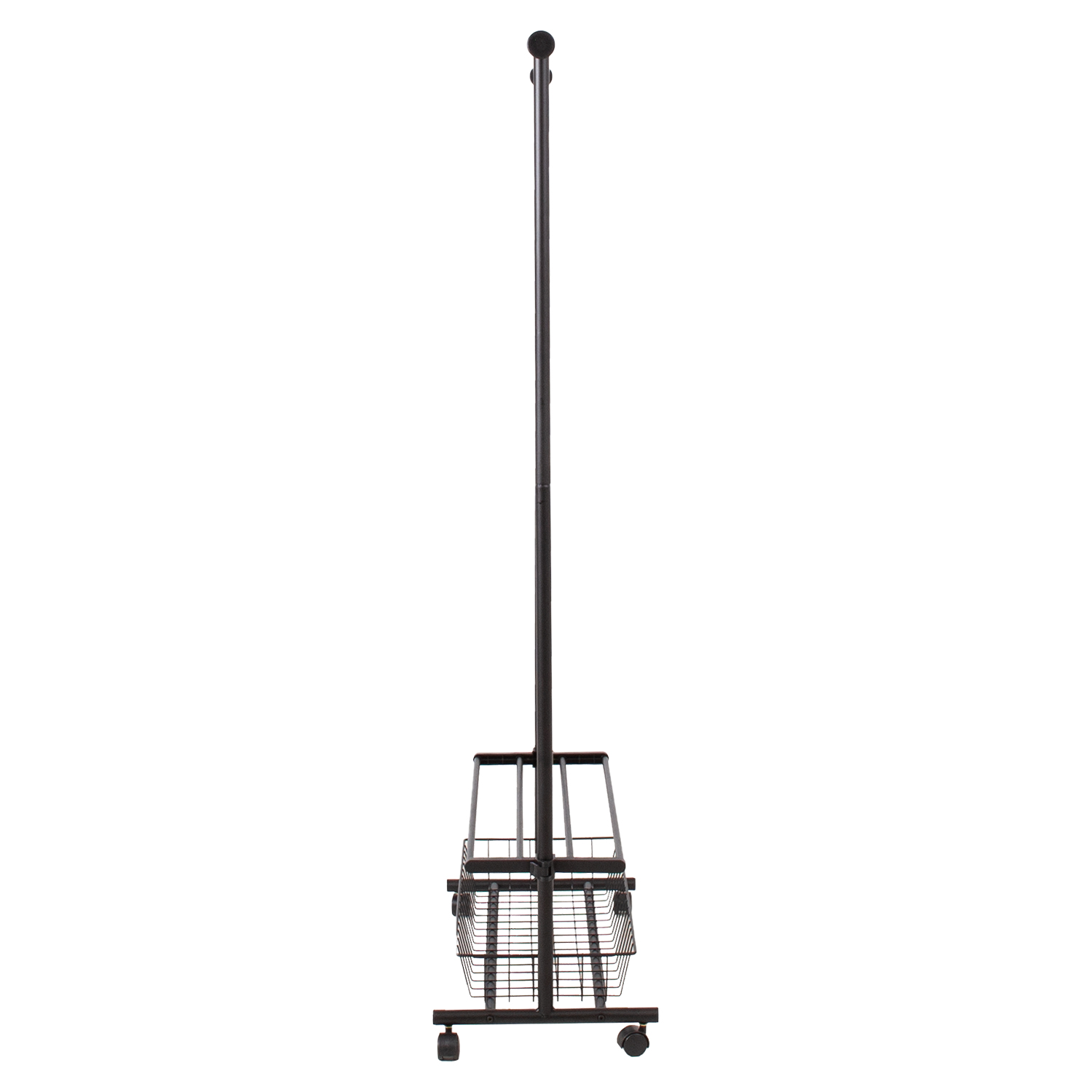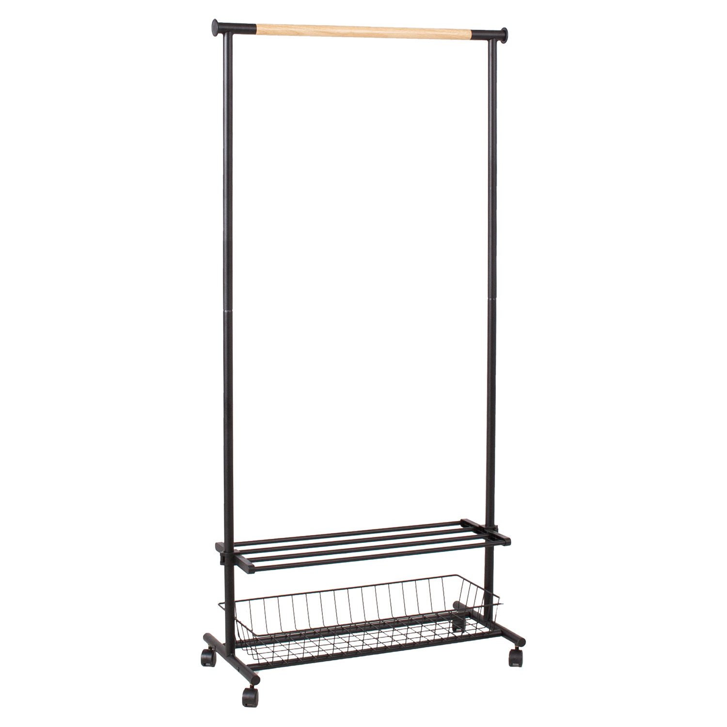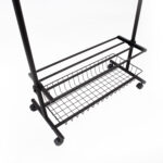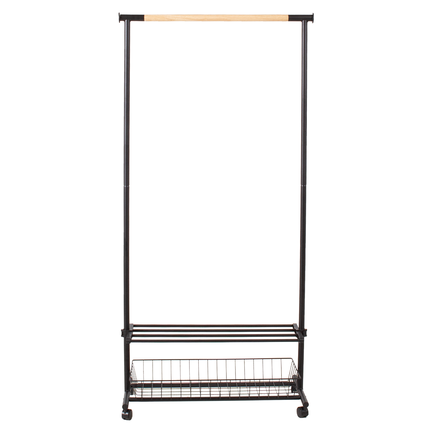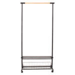 Stange FOREST 2-riiuliga 80x36xH165cm, must/naturaalne. Ratastel liikuv stange on lihtne ja praktiline lahendus riiete ja jalanõude organiseerimiseks. Stange on valmistatud terasest ja viimistletud musta pulbervärviga. Puidust riputuspuu on naturaalses toonis. Stange alumises osas on metallist korv ja riiul. Kandevõime: riputuspuu 10kg, riiul 3kg, korv 7kg.