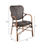Tool BAMBUS käetugedega 55x62xH92,5cm, tumepruun. Prantsuse bistroo stiilist inspireeritud mugav ja vastupidav tool on suurepärane valik koduaeda või kohvikusse. Tool sobib hästi ka siseruumides kasutamiseks. Tooli raam on valmistatud alumiiniumist ja viimistletud bambust meenutava pruuni pulbervärviga. Alumiiniumtoru mõõdud on D28x1,5mm. Iste ja seljatugi on kaetud pruuni textilenega, mis laseb hästi õhku läbi ja kuivab kiiresti. Tooli üldmõõdud on 55x62xH92,5cm, istme laius 46cm, istme sügavus 45cm, istme kõrgus 47cm, seljatoe kõrgus 52cm. Käetoe kõrgus maast 67cm. Kaalupiirang 120kg. Toolid on virnastatavavad ning nende hoiustamine on lihtne ja ruumisäästev. Toode on muutlikes ilmastikutingimustes hästi vastupidav ja lihtsalt hooldatav.