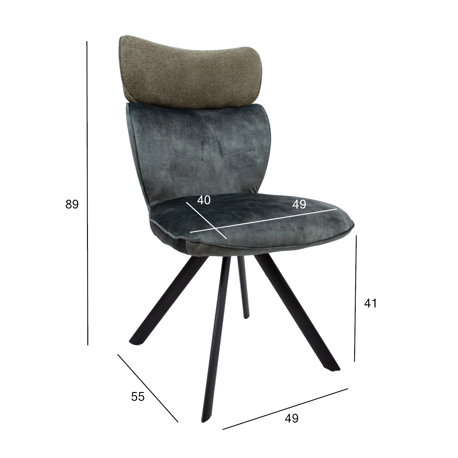 Tool EDDY 49x55xH89cm, roheline samet. Söögitooli mugava vormiga iste on kergelt polsterdatud ja kaetud polüesterkangaga. Kasutatud on toon-toonis, kuid erineva pinna struktuuriga kangaid. Pulbervärvitud mustad metallist jalad. Tooli istmekõrgus 48cm, istme laius 49cm, istme sügavus 42cm. Seljatoe kõrgus 47cm. Kaalupiirang 120kg.