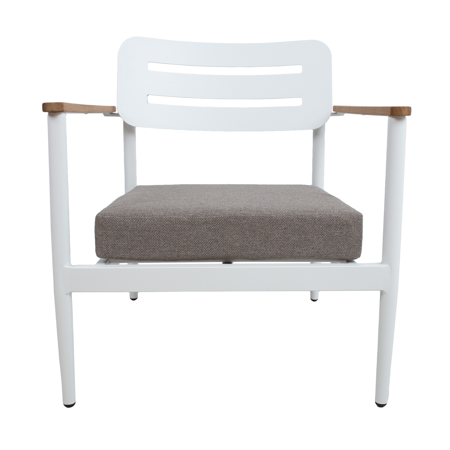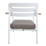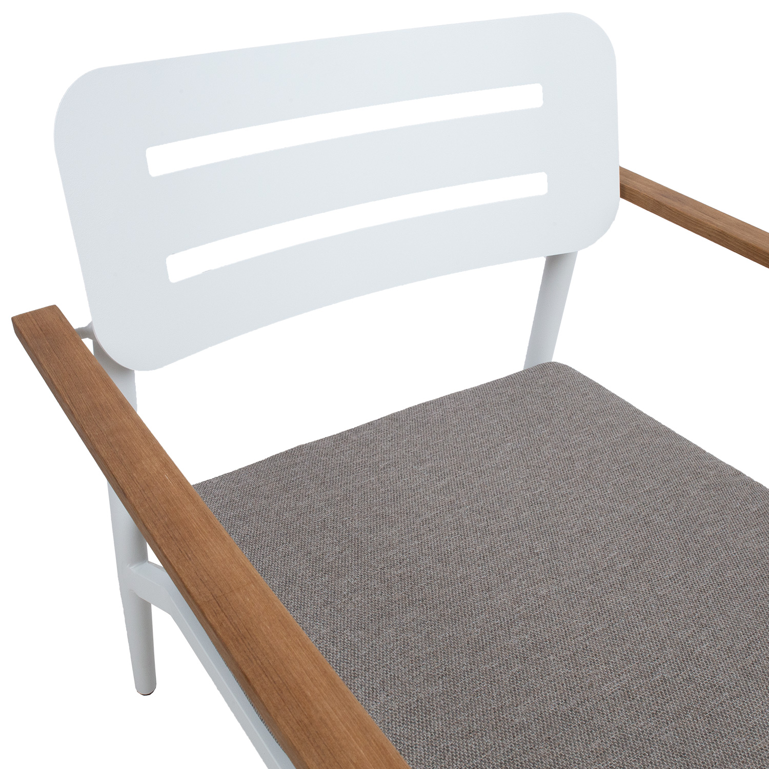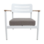 Tool FIRENZE valge. Tooli juurde kuulub pehme 10cm paksune istmepadi, mis on kaetud vett hülgava tumehalli kangaga. Tooli raam on valmistatud valget värvi alumiiniumist. Tooli seljatugi ja iste on valmistatud alumiiniumliistudest ning käetoed tiikpuidust. Metalltorude mõõdud on D35x1,2mm. Tooli mõõdud on 70x75xH80,5cm.