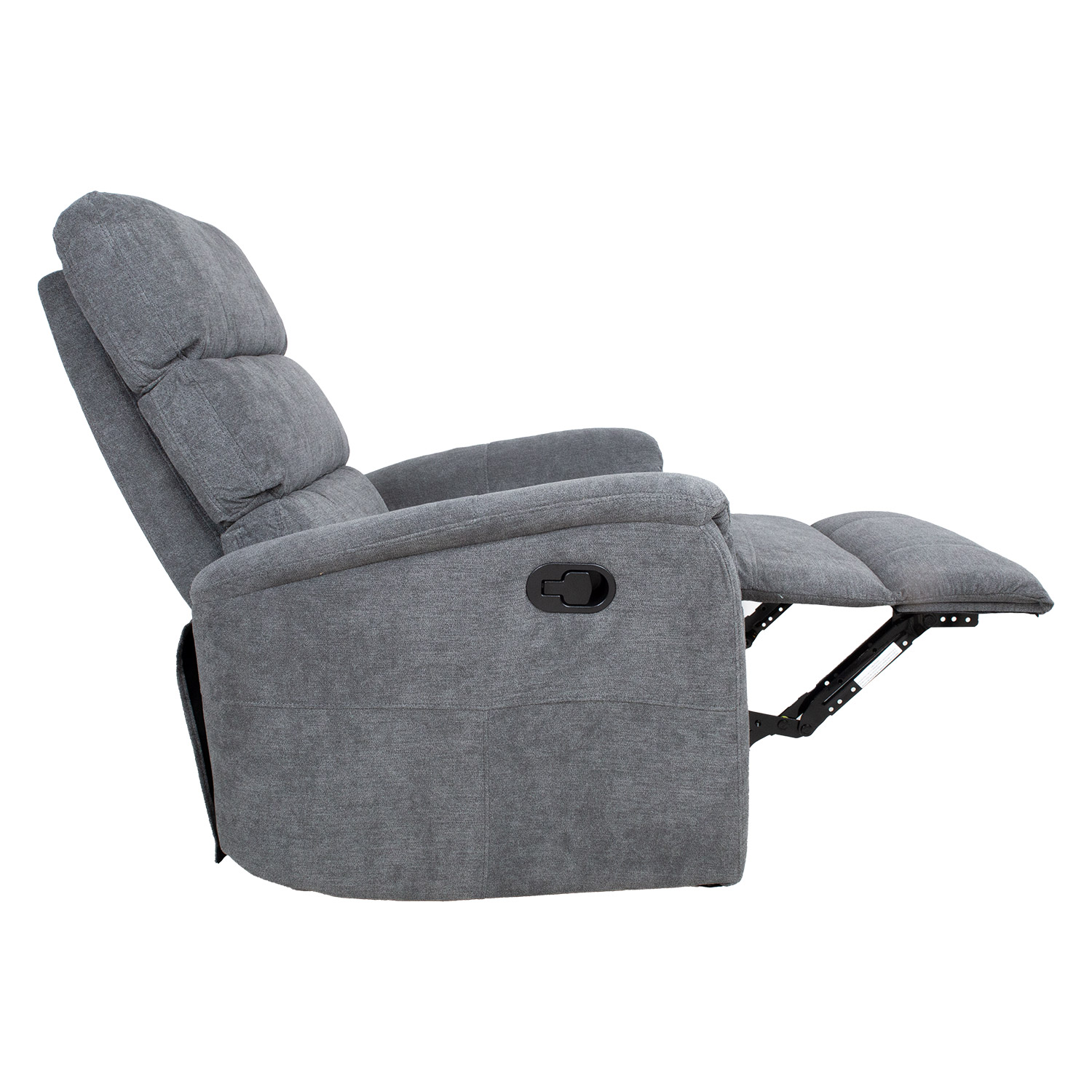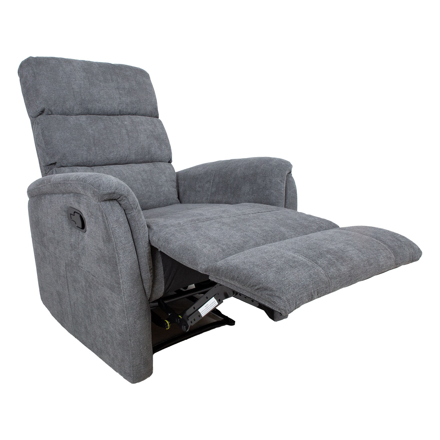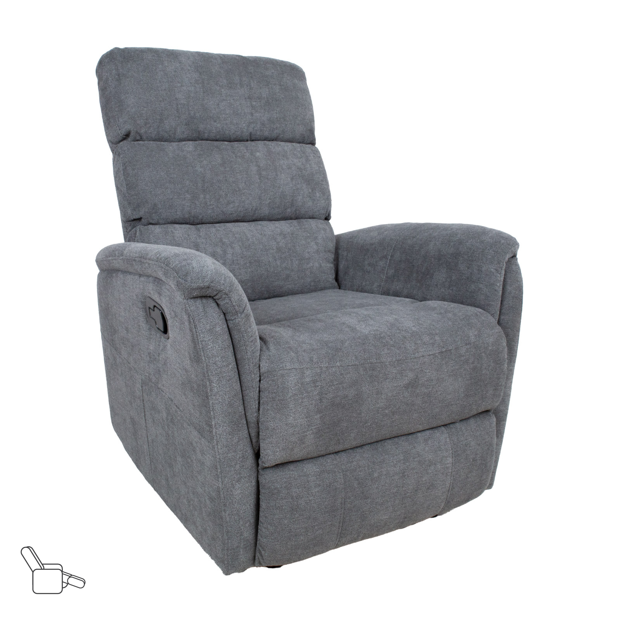 Tugitool BARCLAY manuaalsne recliner 79x86xH105cm, hall. Recliner tüüpi tugitooli jalatoe asendit on võimalik muuta manuaalse mehhanismi abil. Jalatoe tõstmiseks tõmmake tooli paremal välisküljel asuv kang üles. Surudes jalatuge alla fikseerub see automaatselt algasendisse. Kattematerjal: 100% polüesterkangas, Martindale’i väärtus vahemikus 10 000-15 000. Karkass: puit, metall. Polsterdus: polüuretaanvaht 20-24kg/m³. Tooli üldmõõdud on 79x86xH105cm. Istme laius 52cm, istme sügavus 54cm, istme kõrgus 48cm. Seljatoe kõrgus 69cm. Käetoe kõrgus maast 63cm.