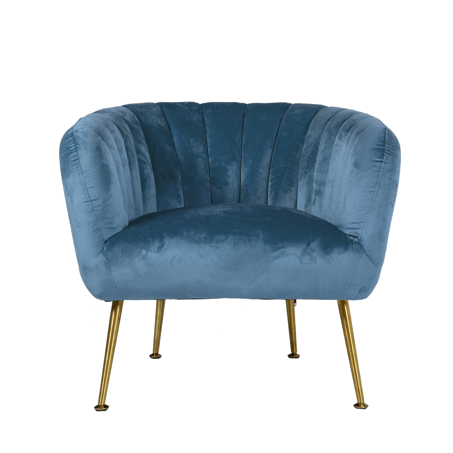Tugitool TUCKER meresinine. Tugitool on kaetud meresinise sametkangaga. Kattematerjal on 100% polüesterkangas. Tugitoolil on kuldsed roostevabast terasest jalad. Toote mõõdud on 78x71xH69cm.
