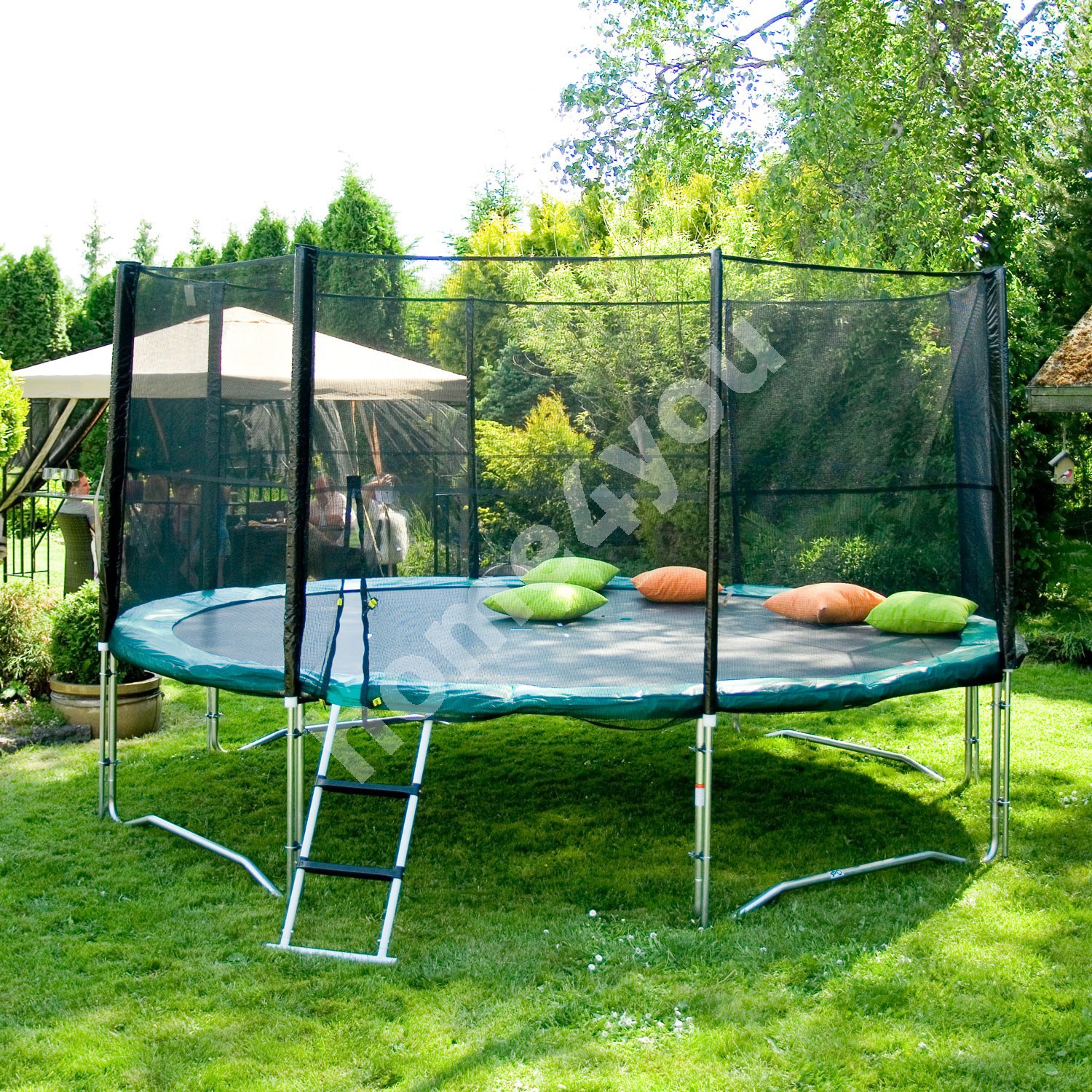 Batuut turvavõrguga 426x274cm, rohelise äärega. Batuut on tore võimalus värskes õhus aktiivseks ajaveetmiseks kogu perele! Batuudi kõrgus maast on 92cm. Elastne ja vastupidav hüppematt on valmistatud musta värvi polüpropeenist. Turvaääre pealmine kiht on valmistatud rohelisest PVC materjalist, alumine pool on polüetüleenkangas. Kahe kihi vahel on 15+6mm polüetüleenvahust pehmendus. Turvaääre laius on 36cm. Batuudi raam ja jalad on valmistatud galvaniseeritud terastorust. Ülemise ääre toru mõõt on D60x2,5mm, jalatorude mõõt on D42x2mm. Batuudil on 92 vedru – 210mm/D25x3,2mm. Turvavõrk on valmistatud musta värvi polüestervõrgust 90g/m². Sissepääsuava on tõmblukuga suletav. Tugipostid on valmistatud galvaniseeritud terastorust D38,1×1,1mm. Postide ümber on vahtplastist pehmendus. Võrgu üldkõrgus on 272cm, kõrgus batuudi äärest 180cm. Kaalupiirang 150kg. HOIUSTAMINE: batuudi eluea pikendamiseks soovitame see suvehooaja lõppedes lahti monteerida ja hoiustada kuivas, hea ventilatsiooniga ruumis. Puhastage ja kuivatage matt, turvavõrk ja turvaäär enne hoiule panekut.