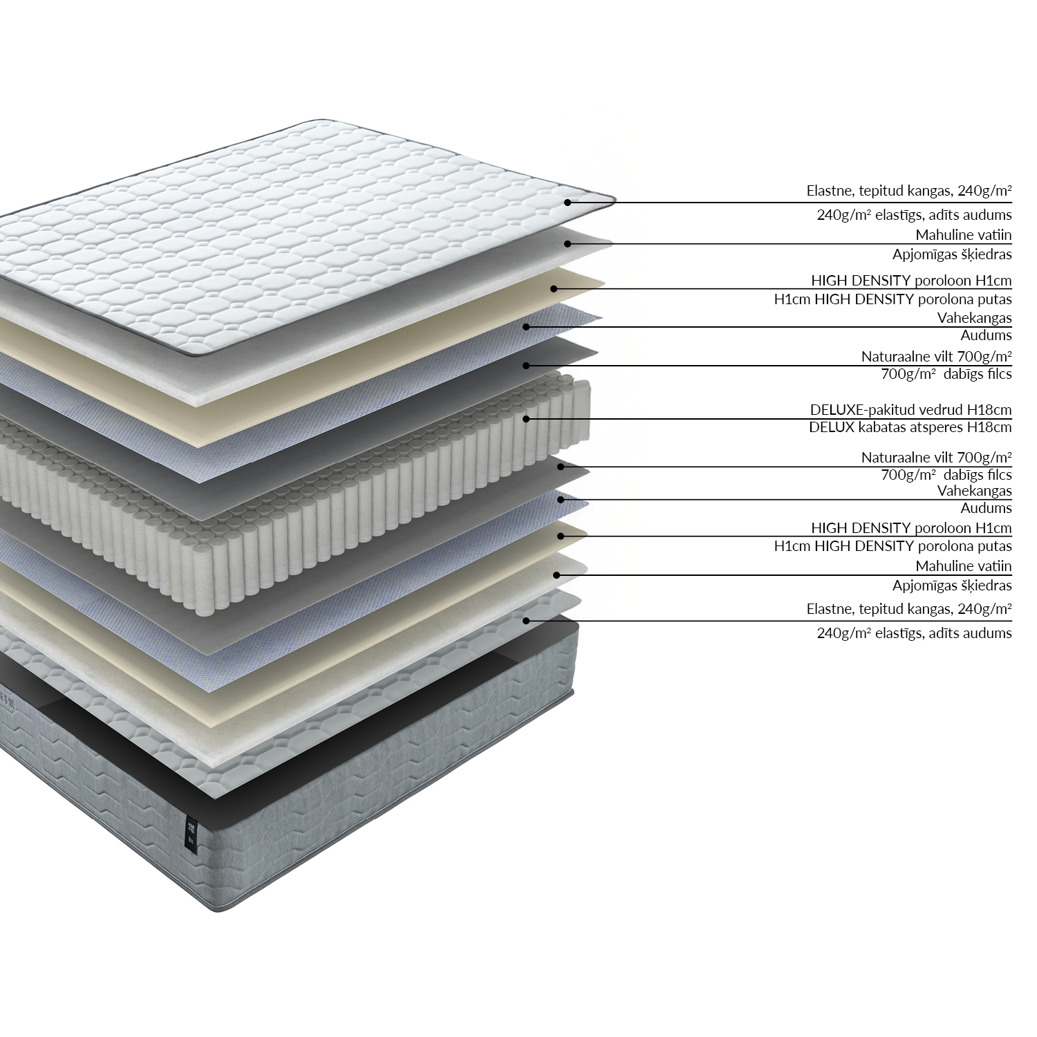 Vedrustus: 1,9mm pocket vedrud, kõrgus 18cm. Vedruploki mõlemad pooled on kaetud 700g vildikihiga.