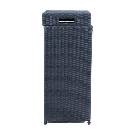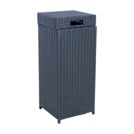 Prügikasti metallraam on kaetud plastikpunutisega.