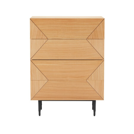 Kummuti korpus on valmistatud mööbliplaadist, mille väliskülg on kaetud naturaalse tammespooniga ja sisemine pool on valge melamiinkattega. Sahtlite esipaneelid on valmistatud MDF plaadist, mille väliskülje geomeetriline disain mängib puidusüü suunaga ning toob elavalt esile loodusliku materjali ilu.