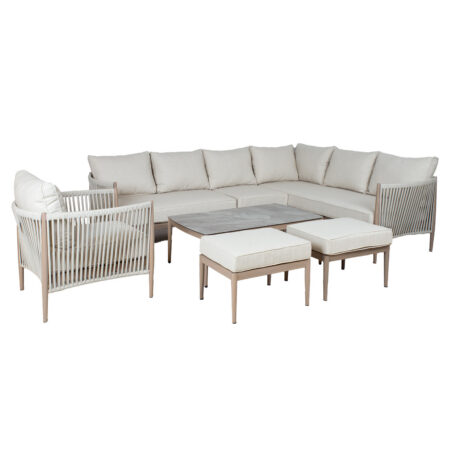 Aiamööblikomplekt MEDINA nurgadiivan, tugitool, 2 tumbat ja diivanlaud, beež.